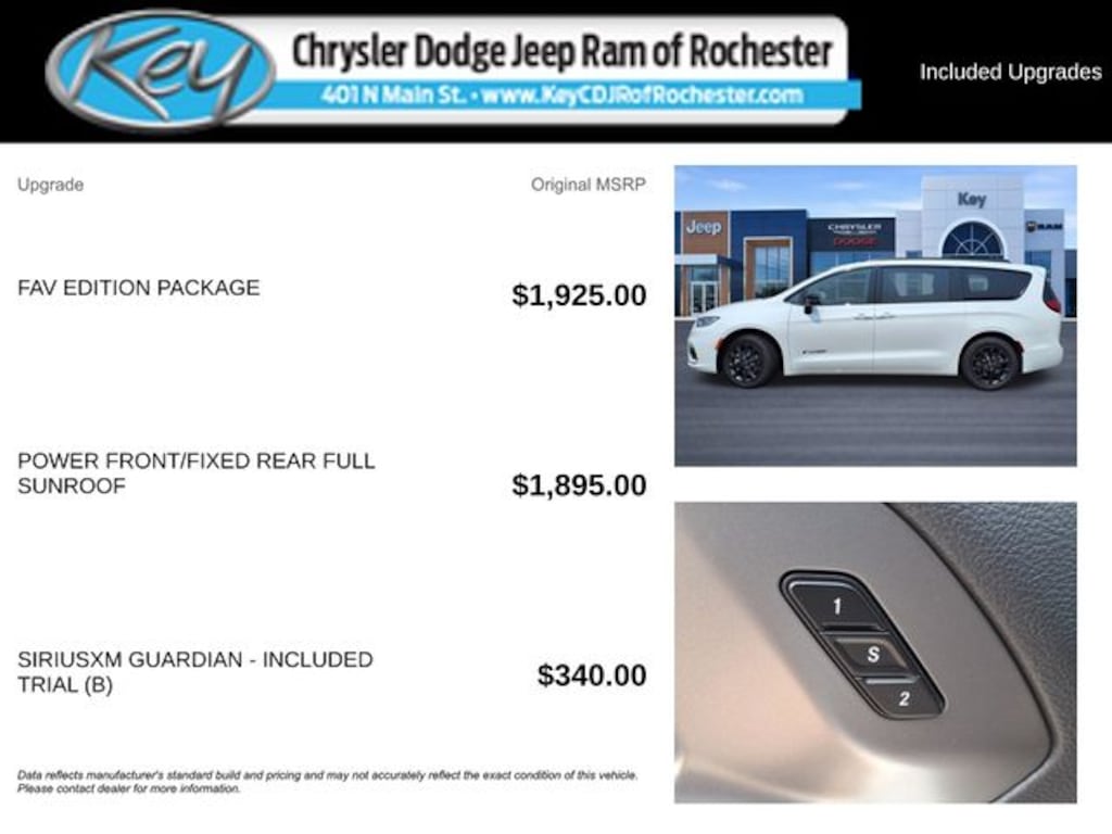 Key Chrysler Dodge Jeep Ram of Rochester is proud to present you with another True Market Priced Vehicle. This 2025 Chrysler Pacifica Select is loaded with the following Factory Options: FAV Edition Package (All Weather Cargo Floor Mats, All Weather Floor Mats - Stow 'N Go, Black Day Light Opening Moldings, Black Stow 'N Place Roof Rack, Cargo Area Liner, Cargo Container, FAV Exterior Graphics, Front Fascia Air Deflectors, Granite Crystal Exterior Badging, Premium Fascia Upper/Lower Grille with Black Surround, Premium Rear Fascia Black, Rear Cargo Bin Stow 'N Go Storage, and Wheels: 18" x 7.5" S-Model Aluminum Design 2), Quick Order Package 27L, 10.1" Touchscreen Display, 17" x 7.0" Aluminum Wheels, 3.25 Axle Ratio, 3rd row seats: split-bench, 4-Wheel Disc Brakes, 4G LTE Wi-Fi Hot Spot, 6 Speakers, ABS brakes, Air Conditioning, Alloy wheels, AM/FM radio: SiriusXM, Apple CarPlay, Apple CarPlay/Android Auto, Auto-dimming Rear-View mirror, Automatic temperature control, Black Seats, Brake assist, Bumpers: body-color, Caprice Leatherette Bucket Seats, Compass, Delay-off headlights, Disassociated Touchscreen Display, Driver door bin, Driver vanity mirror, Driver's Seat Mounted Armrest, Dual front impact airbags, Dual front side impact airbags, Electronic Stability Control, Emergency communication system: Chrysler Connect, For Details, Visit DriveUconnect.com, Four wheel independent suspension, Front anti-roll bar, Front Bucket Seats, Front dual zone A/C, Front fog lights, Front reading lights, Fully automatic headlights, Garage door transmitter, Google Android Auto, GPS Antenna Input, Heated door mirrors, Heated front seats, Heated steering wheel, Illuminated entry, Integrated Active Noise Cancellation, Integrated Center Stack Radio, Knee airbag, Low tire pressure warning, Manufacturer's Statement of Origin, Memory seat, Occupant sensing airbag, Outside temperature display, Overhead airbag, Overhead console, Panic alarm, ParkView Rear Back-Up Camera, Passenger door bin, Passenger seat mounted armrest, Passenger vanity mirror, Power door mirrors, Power driver seat, Power Front/Fixed Rear Full Sunroof, Power Liftgate, Power Open/Close Shade, Power steering, Power windows, Radio data system, Radio: Uconnect 5 with 10.1" Display, Rain sensing wipers, Rear air conditioning, Rear reading lights, Rear window defroster, Rear window wiper, Reclining 3rd row seat, Remote keyless entry, Security system, SiriusXM Guardian - Included Trial (B), Speed control, Split folding rear seat, Spoiler, Steering wheel mounted audio controls, Tachometer, Telescoping steering wheel, Tilt steering wheel, Touring Suspension, Traction control, Trip computer, Turn signal indicator mirrors, USB Host Flip, Variably intermittent wipers, and Voltmeter!!