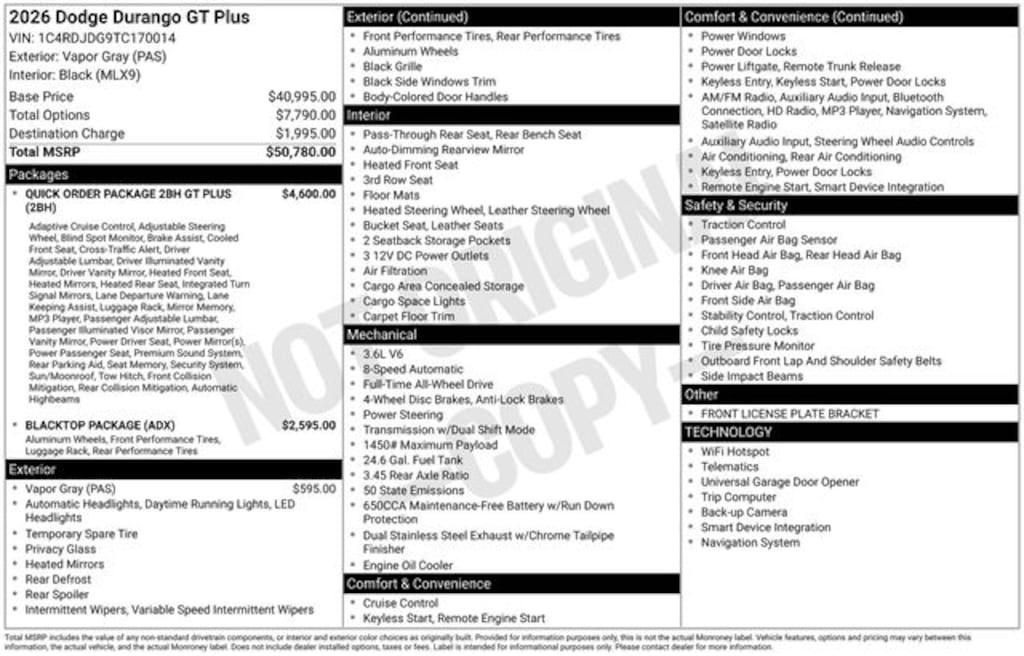 Key Chrysler Dodge Ram of Portsmouth is proud to present you with another True Market Priced Vehicle. This 2026 Dodge Durango GT Plus is loaded with the following Factory Options: AWD Blacktop Package (Black Roof Rails, Gloss Black Badges, GT Gloss Black Badging, Integrated Roof Rail Crossbars, Satin Black Dodge Tail Lamp Badge, and Wheels: 20" x 8" Black Noise Aluminum), Quick Order Package 2BH GT Plus (115V Auxiliary Power Outlet, 180 Amp Alternator, 506 Watt Amplifier, Advanced Brake Assist, Auto High Beam Headlamp Control, Auto-Dimming Exterior Driver Mirror, Bright Cargo Area Scuff Pads, Class IV Receiver Hitch, Dual Remote USB Port - Charge Only, Full Speed Forward Collision Warning Plus, Gloss Black Exterior Mirrors, Heated Second Row Seats, Heavy-Duty Engine Cooling, Lane Departure Warning Plus, Leather Trimmed Bucket Seats, Leather Wrapped Door Panels, Power 6x9 Multi-Function Foldaway Mirrors, Power 8-Way Driver Memory 8-Way Passenger Seats, Power Driver/Passenger 4-Way Lumbar Adjust, Power Sunroof, Rear Load Leveling Suspension, Red Accent Stitching, Security Alarm, Trailer Brake Control, Ventilated Front Seats, and Wireless Charging Pad), AWD, 3.45 Rear Axle Ratio, 3rd row seats: split-bench, 4-Wheel Disc Brakes, 6 Speakers, ABS brakes, Air Conditioning, Alloy wheels, AM/FM radio: SiriusXM w/360L, Apple CarPlay/Android Auto, Auto-dimming Rear-View mirror, Automatic temperature control, Brake assist, Bumpers: body-color, Compass, Delay-off headlights, Driver door bin, Driver vanity mirror, Dual front impact airbags, Dual front side impact airbags, Electronic Stability Control, Emergency communication system: Dodge Connect, Four wheel independent suspension, Front anti-roll bar, Front Bucket Seats, Front Center Armrest w/Storage, Front dual zone A/C, Front License Plate Bracket, Front reading lights, Fully automatic headlights, Garage door transmitter, Heated door mirrors, Heated front seats, Heated steering wheel, Illuminated entry, Knee airbag, Leather steering wheel, Low tire pressure warning, Navigation System, Occupant sensing airbag, Outside temperature display, Overhead airbag, Overhead console, Panic alarm, ParkView Rear Back-Up Camera, Passenger door bin, Passenger vanity mirror, Power door mirrors, Power driver seat, Power Liftgate, Power steering, Power windows, Radio data system, Rear air conditioning, Rear anti-roll bar, Rear reading lights, Rear seat center armrest, Rear window defroster, Rear window wiper, Remote keyless entry, Speed control, Speed-sensing steering, Speed-Sensitive Wipers, Split folding rear seat, Spoiler, Sport steering wheel, Steering wheel mounted audio controls, Tachometer, Telescoping steering wheel, Tilt steering wheel, Traction control, Trip computer, Variably intermittent wipers, Voltmeter, and Wheels: 20" x 8" Fine Silver!!