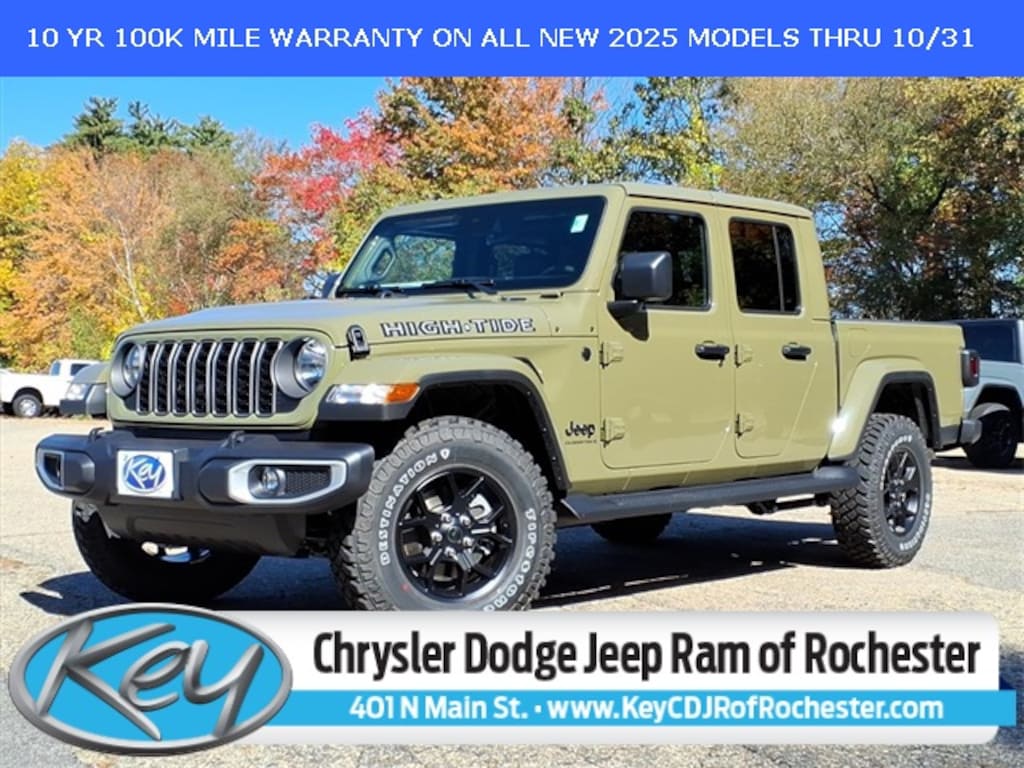 Key Chrysler Dodge Jeep Ram of Rochester is proud to present you with another True Market Priced Vehicle. This 2025 Jeep Gladiator High Tide is loaded with the following Factory Options: Convenience Group (Corning Gorilla Glass, Daytime Running Lamp System, Emergency/Assistance Call, Front Door Locks 2-Door Passive Entry, Heated Front Seats, Heated Steering Wheel, Remote Start System, and Universal Garage Door Opener), Quick Order Package 24Q High Tide (97 MPH Vehicle Max Speed Calibration, Advanced Brake Assist, Automatic Headlamps, Body Color 3-Piece Hard Top, Body Color Fender Flares (2-Piece), Deep Tint Sunscreen Windows, Freedom Panel Storage Bag, Full Length Floor Console Premium Armrest, Full Speed Forward Collision Warning Plus, Hard Seat Back, High Tide, High Tide Tailgate & Hood Decals, Integrated Radar Camera Module (IRCM), Leather Wrapped Park Brake Handle, Leather Wrapped Shift Knob, Power 4-Way Driver Lumbar Adjust, Power 4-Way Passenger Lumbar Adjust, Power Adjust 8-Way Driver Seat, Power Adjust 8-Way Front Passenger Seat, Power Heated Mirrors, Premium Door Trim Panel, Premium McKinley Trimmed Seats, Premium Wrapped Steering Wheel, Rear Armrest w/Cupholder Seat, Rear Sliding Window, Rear Window Defroster, Security Alarm, Sun Visors w/Illuminated Vanity Mirrors, Wheels: 17" x 7.5" Painted Black, and Willys Suspension), Technology Group (115V Auxiliary Power Outlet, 12.3" Touchscreen Display, 400W Inverter, 4G LTE Wi-Fi Hot Spot, Alexa Built-In, Apple CarPlay, Auto-Dimming Rear-View Mirror, Bluetooth Wireless Speaker, Connected Travel & Traffic Services, Connectivity - US/Canada, Google Android Auto, GPS Antenna Input, GPS Navigation, HD Radio, Integrated Center Stack Radio, Integrated Voice Command w/Bluetooth, Media Hub w/2 Charge Only USBs, Radio: Uconnect 5 Nav w/12.3" Display, SiriusXM Radio Service, SiriusXM w/360L, and USB Host Flip), 110 MPH Vehicle Max Speed Calibration, 3.73 Rear Axle Ratio, 4-Wheel Disc Brakes, 8 Speakers, ABS brakes, Air Conditioning, Alpine Premium Audio System, AM/FM radio: SiriusXM, Apple CarPlay/Android Auto, Brake assist, Cloth Low-Back Bucket Seats, Compass, Delay-off headlights, Driver door bin, Driver vanity mirror, Dual front impact airbags, Dual front side impact airbags, Electronic Stability Control, Front anti-roll bar, Front Bucket Seats, Front Center Armrest w/Storage, Front fog lights, Front License Plate Bracket, Front reading lights, Illuminated entry, Integrated roll-over protection, Low tire pressure warning, Manufacturer's Statement of Origin, Normal Duty Suspension, Occupant sensing airbag, Outside temperature display, Overhead airbag, Panic alarm, ParkView Rear Back-Up Camera, Passenger door bin, Passenger vanity mirror, Power steering, Power windows, Radio data system, Radio: Uconnect 5 w/12.3" Display, Rear anti-roll bar, Rear reading lights, Remote keyless entry, Side Steps, Speed control, Split folding rear seat, Steering wheel mounted audio controls, Tachometer, Telescoping steering wheel, Tilt steering wheel, Traction control, Trip computer, Variably inter Call us to ask about conditional rebates. Price includes: $2250 - 2025 National Bonu