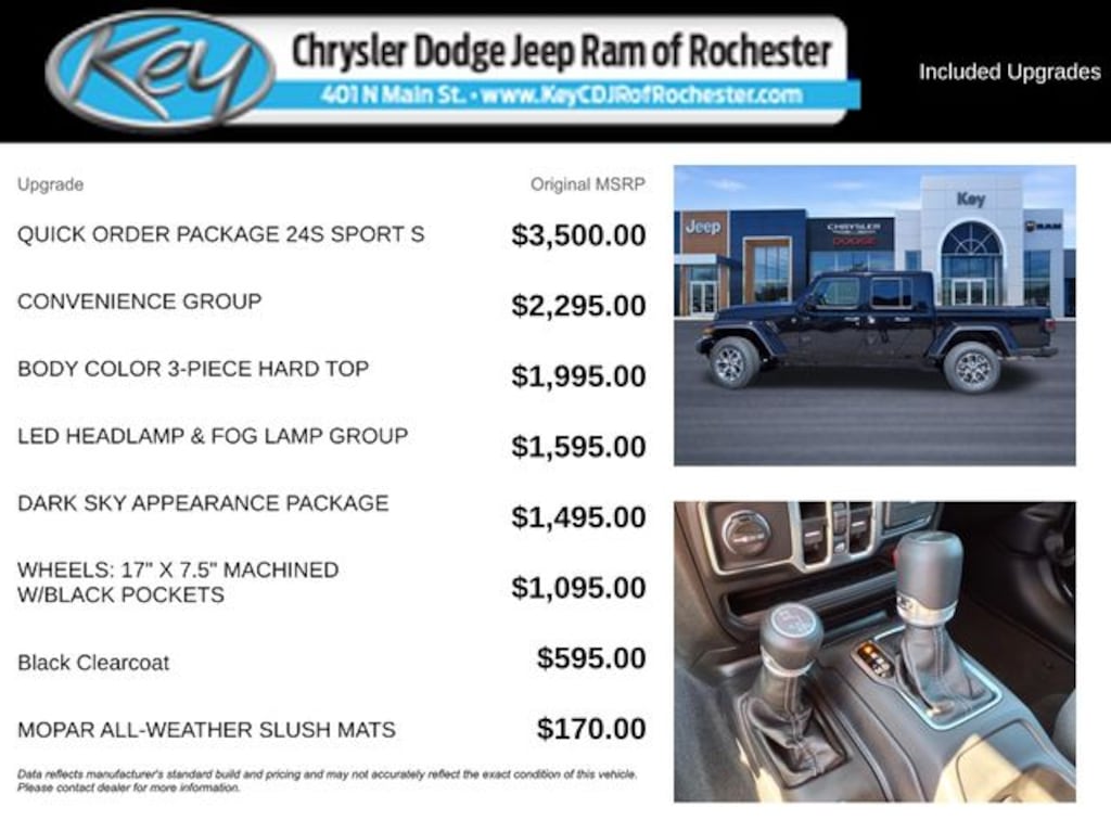 Key Chrysler Dodge Jeep Ram of Rochester is proud to present you with another True Market Priced Vehicle. This 2025 Jeep Gladiator Sport S is loaded with the following Factory Options: Convenience Group (Corning Gorilla Glass, Daytime Running Lamp System, Emergency/Assistance Call, Front Door Locks 2-Door Passive Entry, Heated Front Seats, Heated Steering Wheel, Remote Start System, and Universal Garage Door Opener), Dark Sky Appearance Package (Body Color Fender Flares (2-Piece), Mold In Color Bumper w/Gloss Black, and Performance Hood), LED Headlamp & Fog Lamp Group (Daytime Running Lamps LED Accents, Front LED Fog Lamps, and LED Premium Reflector Headlamps), Quick Order Package 24S Sport S (Advanced Brake Assist, Automatic Headlamps, Deep Tint Sunscreen Windows, Enhanced Adaptive Cruise Control, Full Speed Forward Collision Warning Plus, Normal Duty Plus Suspension, Power Heated Mirrors, Premium Wrapped Steering Wheel, Security Alarm, Sun Visors w/Illuminated Vanity Mirrors, and Wheels: 17" x 7.5" Gray), 110 MPH Vehicle Max Speed Calibration, 12.3" Touchscreen Display, 3.73 Rear Axle Ratio, 4-Wheel Disc Brakes, 4G LTE Wi-Fi Hot Spot, 8 Speakers, ABS brakes, Air Conditioning, Alexa Built-In, AM/FM radio: SiriusXM, Apple CarPlay, Apple CarPlay/Android Auto, Body Color 3-Piece Hard Top, Brake assist, Cloth Low-Back Bucket Seats, Compass, Connectivity - US/Canada, Delay-off headlights, Driver door bin, Driver vanity mirror, Dual front impact airbags, Dual front side impact airbags, Electronic Stability Control, Freedom Panel Storage Bag, Front anti-roll bar, Front Bucket Seats, Front Center Armrest w/Storage, Front fog lights, Front License Plate Bracket, Front reading lights, Google Android Auto, Illuminated entry, Integrated roll-over protection, Low tire pressure warning, MOPAR All-Weather Slush Mats, Normal Duty Suspension, Occupant sensing airbag, Outside temperature display, Overhead airbag, Panic alarm, ParkView Rear Back-Up Camera, Passenger door bin, Passenger vanity mirror, Power steering, Power windows, Radio data system, Radio: Uconnect 5 w/12.3" Display, Rear anti-roll bar, Rear reading lights, Rear Sliding Window, Rear Window Defroster, Remote keyless entry, Speed control, Split folding rear seat, Steering wheel mounted audio controls, Tachometer, Telescoping steering wheel, Tilt steering wheel, Traction control, Trip computer, USB Host Flip, Variably intermittent wipers, Voltmeter, Wheels: 17" x 7.5" Black Steel Styled, and Wheels: 17" x 7.5" Machined w/Black Pockets!! Call us to ask about conditional rebates. Price includes: $1000 - 2025 National Select Inventory Bonus Cash. Exp. 01/04/2027 $2000 - 2025 National Select Inventory Bonus Cash. Exp. 03/02/2026 $2250 - 2025 National Retail Bonus Cash . Exp. 03/02/2026