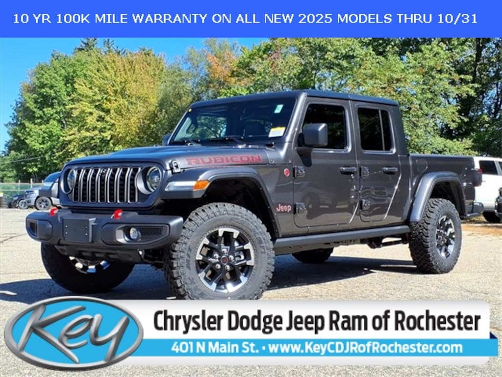 Key Chrysler Dodge Jeep Ram of Rochester is proud to present you with another True Market Priced Vehicle. This 2025 Jeep Gladiator Rubicon is loaded with the following Factory Options: Convenience Group (Heated Front Seats, Heated Steering Wheel, Remote Start System, SiriusXM Radio Service, SiriusXM w/360L, and Universal Garage Door Opener), Quick Order Package 24R Rubicon, Technology Group (12.3" Touchscreen Display, 4G LTE Wi-Fi Hot Spot, Alexa Built-In, Apple CarPlay, Auto-Dimming Rear-View Mirror, Bluetooth Wireless Speaker, Connected Travel & Traffic Services, Connectivity - US/Canada, Google Android Auto, GPS Antenna Input, GPS Navigation, HD Radio, Integrated Off-Road Camera, Integrated Voice Command w/Bluetooth, Radio: Uconnect 5 Nav w/12.3" Display, and USB Host Flip), 4-Wheel Disc Brakes, 4.10 Rear Axle Ratio, 8 Speakers, 97 MPH Vehicle Max Speed Calibration, ABS brakes, Air Conditioning, Alloy wheels, Alpine Premium Audio System, AM/FM radio: SiriusXM, Apple CarPlay/Android Auto, Automatic temperature control, Black 3-Piece Hard Top, Body Color Rubicon Highline Flare, Brake assist, Cloth Low-Back Bucket Seats, Compass, Delay-off headlights, Driver door bin, Driver vanity mirror, Dual front impact airbags, Dual front side impact airbags, Electronic Stability Control, Emergency communication system: Jeep Connect, Freedom Panel Storage Bag, Front anti-roll bar, Front Bucket Seats, Front Center Armrest w/Storage, Front dual zone A/C, Front fog lights, Front License Plate Bracket, Front reading lights, Fully automatic headlights, Heated door mirrors, Illuminated entry, Integrated roll-over protection, Low tire pressure warning, Occupant sensing airbag, Outside temperature display, Overhead airbag, Panic alarm, Passenger door bin, Passenger vanity mirror, Performance Suspension, Power door mirrors, Power steering, Power windows, Radio data system, Radio: Uconnect 5 w/12.3" Display, Rear anti-roll bar, Rear reading lights, Rear Sliding Window, Rear Window Defroster, Remote keyless entry, Security system, Speed control, Split folding rear seat, Steering wheel mounted audio controls, Tachometer, Telescoping steering wheel, Tilt steering wheel, Traction control, Trip computer, Variably intermittent wipers, Voltmeter, Wheels: 17" x 7.5" Machined w/Black Pockets, and Wheels: 17" x 7.5" Machined/Painted Black!! Call us to ask about conditional rebates. Price includes: $5500 - 2025 National Bonus Cash . Exp. 11/03/2025