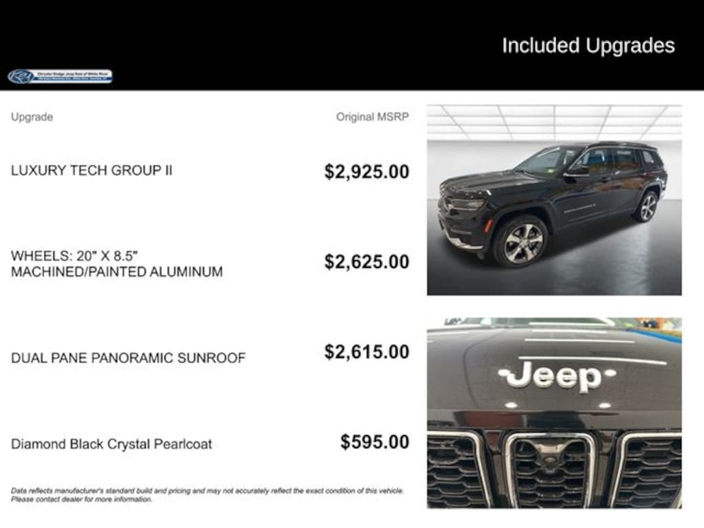 Key Chrysler Dodge Jeep Ram of White River is proud to present you with another True Market Priced Vehicle. This 2025 Jeep Grand Cherokee L Limited is loaded with the following Factory Options: Luxury Tech Group II (2nd Row Manual Window Shades, Auto-Dimming Exterior Driver Mirror, Capri Leatherette with Axis II Seats, Integrated Off-Road Camera, Intersection Collision Assist System, Memory Steering Column, ParkSense Front/Rear Park Assist with Stop, Passive Entry - Front/Rear Doors, Liftgate, Power Tilt/Telescope Steering Column, Rain Sensitive Windshield Wipers, Rear Back Up Camera Washer, Rearview Autodim Digital Display Mirror, Surround View Camera System, Ventilated Front Seats, and Wireless Charging Pad), Quick Order Package 22E, 3.45 Rear Axle Ratio, 3rd row seats: split-bench, 4-Wheel Disc Brakes, 6 Speakers, ABS brakes, Active Noise Control System, Air Conditioning, Alloy wheels, AM/FM radio: SiriusXM with 360L, Anti-whiplash front head restraints, Audio memory, Auto High-beam Headlights, Automatic temperature control, Brake assist, Bumpers: body-color, Capri Leatherette Seats, Compass, Delay-off headlights, Driver door bin, Driver vanity mirror, Dual front impact airbags, Dual front side impact airbags, Dual-Pane Panoramic Sunroof, Electronic Stability Control, Emergency communication system, Four wheel independent suspension, Front anti-roll bar, Front Bucket Seats, Front Center Armrest w/Storage, Front dual zone A/C, Front fog lights, Front License Plate Bracket, Front reading lights, Fully automatic headlights, Garage door transmitter, Heated door mirrors, Heated front seats, Heated rear seats, Heated steering wheel, Illuminated entry, Interior Rear Facing Camera, Knee airbag, Low tire pressure warning, Manual Fold Seatbacks, Memory seat, Model Year Tracking, Navigation System, Normal Duty Suspension, Occupant sensing airbag, Outside temperature display, Overhead airbag, Overhead console, Panic alarm, ParkView Rear Back-Up Camera, Passenger door bin, Passenger vanity mirror, Power door mirrors, Power driver seat, Power Liftgate, Power passenger seat, Power steering, Power windows, Radio data system, Radio: Uconnect 5 Nav with 10.1" Display, Rear air conditioning, Rear anti-roll bar, Rear reading lights, Rear window defroster, Rear window wiper, Reclining 3rd row seat, Remote keyless entry, Security system, Speed control, Speed-Sensitive Wipers, Split folding rear seat, Spoiler, Steering wheel mounted audio controls, Tachometer, Telescoping steering wheel, Tilt steering wheel, Traction control, Trip computer, Turn signal indicator mirrors, Variably intermittent wipers, Voltmeter, Wheels: 18" x 8.0" Polished/Painted Aluminum, and Wheels: 20" x 8.5" Machined/Painted Aluminum!!