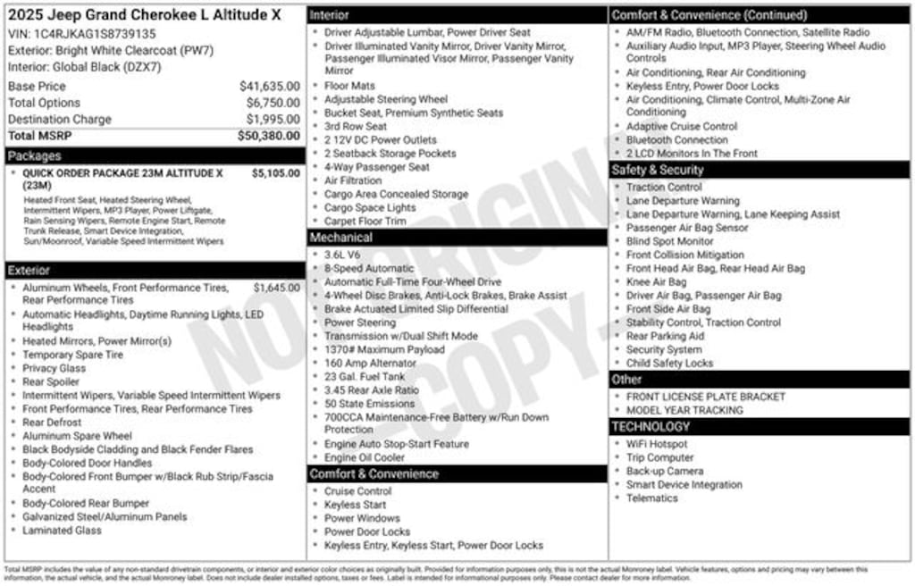 Key Chrysler Dodge Jeep Ram of White River is proud to present you with another True Market Priced Vehicle. This 2025 Jeep Grand Cherokee L Altitude X is loaded with the following Factory Options: Quick Order Package 23M Altitude X (115V Auxiliary Power Outlet, 3rd Row Charge-Only USB Ports, Altitude X, Black Headliner, Capri Leatherette/Suede Seats, Delete Laredo Badge, Gloss Black Exterior Accents, Heated Front Seats, Heated Steering Wheel, Power Liftgate, Power Sunroof, Rain Sensitive Windshield Wipers, Remote Start System, Selectable Tire Fill Alert, Wheels: 18" x 8.0" Fully Painted Aluminum 1, and Wireless Charging Pad), 3.45 Rear Axle Ratio, 3rd row seats: split-bench, 4-Wheel Disc Brakes, 6 Speakers, ABS brakes, Air Conditioning, Alloy wheels, AM/FM radio: SiriusXM, Anti-whiplash front head restraints, Automatic temperature control, Brake assist, Bumpers: body-color, Cloth Seats, Compass, Delay-off headlights, Driver door bin, Driver vanity mirror, Dual front impact airbags, Dual front side impact airbags, Electronic Stability Control, Emergency communication system, Four wheel independent suspension, Front anti-roll bar, Front Bucket Seats, Front Center Armrest w/Storage, Front dual zone A/C, Front License Plate Bracket, Front reading lights, Fully automatic headlights, Heated door mirrors, Illuminated entry, Knee airbag, Low tire pressure warning, Manual Fold Seatbacks, Model Year Tracking, Normal Duty Suspension, Occupant sensing airbag, Outside temperature display, Overhead airbag, Overhead console, Panic alarm, ParkView Rear Back-Up Camera, Passenger door bin, Passenger vanity mirror, Power door mirrors, Power driver seat, Power steering, Power windows, Radio data system, Rear air conditioning, Rear anti-roll bar, Rear reading lights, Rear window defroster, Rear window wiper, Reclining 3rd row seat, Remote keyless entry, Security system, Speed control, Speed-Sensitive Wipers, Split folding rear seat, Spoiler, Steering wheel mounted audio controls, Tachometer, Telescoping steering wheel, Tilt steering wheel, Traction control, Trip computer, Variably intermittent wipers, Voltmeter, Wheels: 18" x 8.0" Fully Painted Aluminum, and Wheels: 20" x 8.5" Gloss Black Painted Aluminum!!
