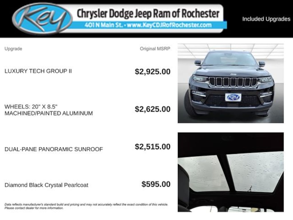 Key Chrysler Dodge Jeep Ram of Rochester is proud to present you with another True Market Priced Vehicle. This 2025 Jeep Grand Cherokee Limited is loaded with the following Factory Options: 4WD Luxury Tech Group II (2nd-Row Manual Window Shades, Auto-Dimming Exterior Driver Mirror, Capri Leatherette with Axis II Seats, Front/Rear Doors and Liftgate with Passive Entry, Integrated Off-Road Camera, Intersection Collision Assist System, Memory Steering Column, ParkSense Front/Rear Park Assist with Stop, Power Tilt/Telescope Steering Column, Rain Sensitive Windshield Wipers, Rear Back-Up Camera Washer, Rearview Autodim Digital Display Mirror, Surround View Camera System, Ventilated Front Seats, and Wireless Charging Pad), Quick Order Package 22E, 4WD, 4-Wheel Disc Brakes, 6 Speakers, ABS brakes, Active Noise Control System, Air Conditioning, Alloy wheels, AM/FM radio: SiriusXM with 360L, Anti-whiplash front head restraints, Audio memory, Auto High-beam Headlights, Automatic temperature control, Brake assist, Bumpers: body-color, Capri Leatherette Seats, Compass, Delay-off headlights, Driver door bin, Driver vanity mirror, Dual front impact airbags, Dual front side impact airbags, Dual-Pane Panoramic Sunroof, Electronic Stability Control, Emergency communication system, Four wheel independent suspension, Front anti-roll bar, Front Bucket Seats, Front Center Armrest w/Storage, Front dual zone A/C, Front fog lights, Front License Plate Bracket, Front reading lights, Fully automatic headlights, Garage door transmitter, Heated door mirrors, Heated front seats, Heated rear seats, Heated steering wheel, Illuminated entry, Knee airbag, Low tire pressure warning, Memory seat, Model Year Tracking, Navigation System, Normal Duty Suspension, Occupant sensing airbag, Outside temperature display, Overhead airbag, Overhead console, Panic alarm, ParkView Rear Back-Up Camera, Passenger door bin, Passenger vanity mirror, Power door mirrors, Power driver seat, Power Liftgate, Power passenger seat, Power steering, Power windows, Radio data system, Radio: Uconnect 5 Nav with 10.1" Display, Rear anti-roll bar, Rear reading lights, Rear window defroster, Rear window wiper, Remote keyless entry, Security system, Speed control, Speed-Sensitive Wipers, Split folding rear seat, Spoiler, Steering wheel mounted audio controls, Tachometer, Telescoping steering wheel, Tilt steering wheel, Traction control, Trip computer, Turn signal indicator mirrors, Variably intermittent wipers, Voltmeter, Wheels: 18" x 8" Polished/Painted Aluminum, and Wheels: 20" x 8.5" Machined/Painted Aluminum!! Call us to ask about conditional rebates. Price includes: $2000 - 2025 National Holiday Select Inventory Bonus Cash. Exp. 01/05/2026 $2250 - 2025 National Retail Bonus Cash . Exp. 01/05/2026
