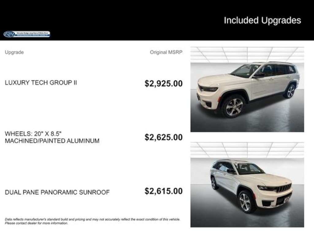 Key Chrysler Dodge Jeep Ram of White River is proud to present you with another True Market Priced Vehicle. This 2025 Jeep Grand Cherokee L Limited is loaded with the following Factory Options: Luxury Tech Group II (2nd Row Manual Window Shades, Auto-Dimming Exterior Driver Mirror, Capri Leatherette with Axis II Seats, Integrated Off-Road Camera, Intersection Collision Assist System, Memory Steering Column, ParkSense Front/Rear Park Assist with Stop, Passive Entry - Front/Rear Doors, Liftgate, Power Tilt/Telescope Steering Column, Rain Sensitive Windshield Wipers, Rear Back Up Camera Washer, Rearview Autodim Digital Display Mirror, Surround View Camera System, Ventilated Front Seats, and Wireless Charging Pad), Quick Order Package 23E, 3.45 Rear Axle Ratio, 3rd row seats: split-bench, 4-Wheel Disc Brakes, 6 Speakers, ABS brakes, Active Noise Control System, Air Conditioning, Alloy wheels, AM/FM radio: SiriusXM with 360L, Anti-whiplash front head restraints, Audio memory, Auto High-beam Headlights, Automatic temperature control, Brake assist, Bumpers: body-color, Capri Leatherette Seats, Compass, Delay-off headlights, Driver door bin, Driver vanity mirror, Dual front impact airbags, Dual front side impact airbags, Dual-Pane Panoramic Sunroof, Electronic Stability Control, Emergency communication system, Four wheel independent suspension, Front anti-roll bar, Front Bucket Seats, Front Center Armrest w/Storage, Front dual zone A/C, Front fog lights, Front License Plate Bracket, Front reading lights, Fully automatic headlights, Garage door transmitter, Heated door mirrors, Heated front seats, Heated rear seats, Heated steering wheel, Illuminated entry, Interior Rear Facing Camera, Knee airbag, Low tire pressure warning, Manual Fold Seatbacks, Memory seat, Model Year Tracking, Navigation System, Normal Duty Suspension, Occupant sensing airbag, Outside temperature display, Overhead airbag, Overhead console, Panic alarm, ParkView Rear Back-Up Camera, Passenger door bin, Passenger vanity mirror, Power door mirrors, Power driver seat, Power Liftgate, Power passenger seat, Power steering, Power windows, Radio data system, Radio: Uconnect 5 Nav with 10.1" Display, Rear air conditioning, Rear anti-roll bar, Rear reading lights, Rear window defroster, Rear window wiper, Reclining 3rd row seat, Remote keyless entry, Security system, Speed control, Speed-Sensitive Wipers, Split folding rear seat, Spoiler, Steering wheel mounted audio controls, Tachometer, Telescoping steering wheel, Tilt steering wheel, Traction control, Trip computer, Turn signal indicator mirrors, Variably intermittent wipers, Voltmeter, Wheels: 18" x 8.0" Polished/Painted Aluminum, and Wheels: 20" x 8.5" Machined/Painted Aluminum!!