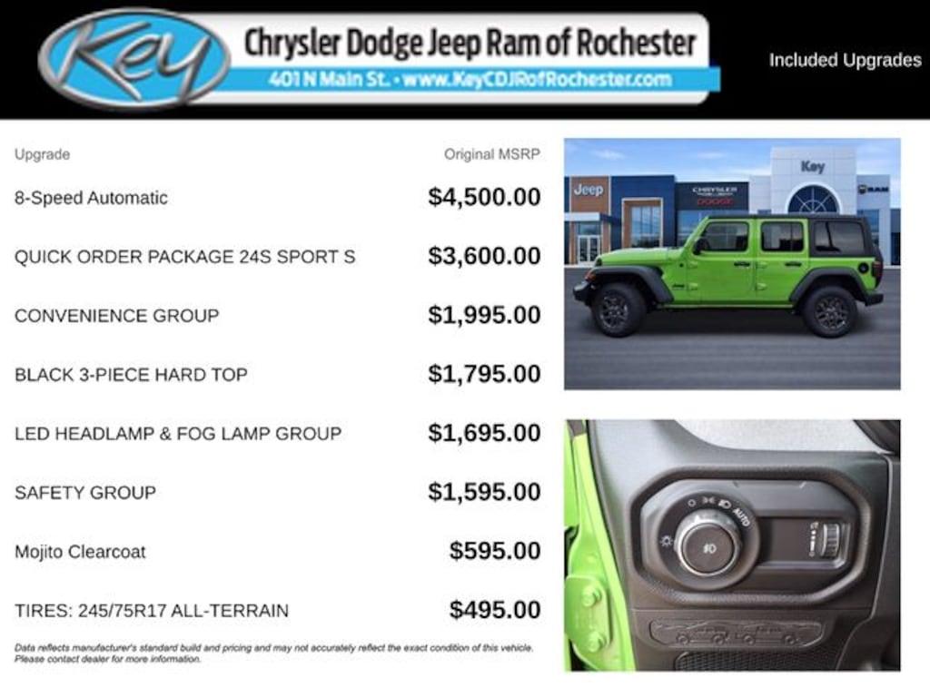 Key Chrysler Dodge Jeep Ram of Rochester is proud to present you with another True Market Priced Vehicle. This 2025 Jeep Wrangler Sport S is loaded with the following Factory Options: Convenience Group (2-Door Passive Entry, Front Door Locks, Air Conditioning w/Auto Temperature Control, Air Filtering, Cluster 7.0" TFT Color Display, Emergency/Assistance Call, Heated Front Seats, Heated Steering Wheel, Remote Start System, and Universal Garage Door Opener), LED Headlamp & Fog Lamp Group (Front LED Fog Lamps and LED Premium Reflector Headlamps), Quick Order Package 24S Sport S (Advanced Brake Assist, Automatic Headlamps, Corning Gorilla Glass, Deep Tint Sunscreen Windows, Enhanced Adaptive Cruise Control, Full Speed Forward Collision Warning Plus, Power Heated Mirrors, Premium Wrapped Steering Wheel, Security Alarm, Sun Visors w/Illuminated Vanity Mirrors, and Wheels: 17" x 7.5" Gray), Safety Group (Auto High Beam Headlamp Control, Blind Spot & Cross Path Detection, Injection Molded Black Rear Bumper, LED Taillamps, and ParkSense Rear Park Assist System), 110 MPH Vehicle Max Speed Calibration, 3.45 Overall Top Gear Ratio, 4-Wheel Disc Brakes, 8 Speakers, ABS brakes, Air Conditioning, AM/FM radio: SiriusXM, Apple CarPlay/Android Auto, Aux Battery, Black 3-Piece Hard Top, Brake assist, Cloth Low-Back Bucket Seats, Compass, Delay-off headlights, Driver door bin, Driver vanity mirror, Dual front impact airbags, Dual front side impact airbags, Electronic Stability Control, Freedom Panel Storage Bag, Front anti-roll bar, Front Bucket Seats, Front Center Armrest w/Storage, Front fog lights, Front reading lights, Illuminated entry, Integrated roll-over protection, Jeep Trail Rated Kit, Low tire pressure warning, MOPAR All-Weather Floor Mats, Non-Lock Fuel Cap w/o Discriminator, Normal Duty Suspension, Occupant sensing airbag, Outside temperature display, Overhead airbag, Panic alarm, ParkView Rear Back-Up Camera, Passenger door bin, Passenger vanity mirror, Power steering, Power windows, Radio data system, Radio: Uconnect 5 w/12.3" Display, Rear anti-roll bar, Rear reading lights, Rear Window Defroster, Rear Window Wiper/Washer, Remote keyless entry, Speed control, Split folding rear seat, Steering wheel mounted audio controls, Stop-Start Dual Battery System, Tachometer, Telescoping steering wheel, Tilt steering wheel, Traction control, Trip computer, Variably intermittent wipers, and Wheels: 17" x 7.5" Black Steel Styled!! Call us to ask about conditional rebates. Price includes: $1500 - 2025 National Bonus Cash . Exp. 03/02/2026 $2000 - 2025 National Select Inventory Bonus Cash. Exp. 03/02/2026 $2500 - 2025 National Retail Bonus Cash . Exp. 03/02/2026