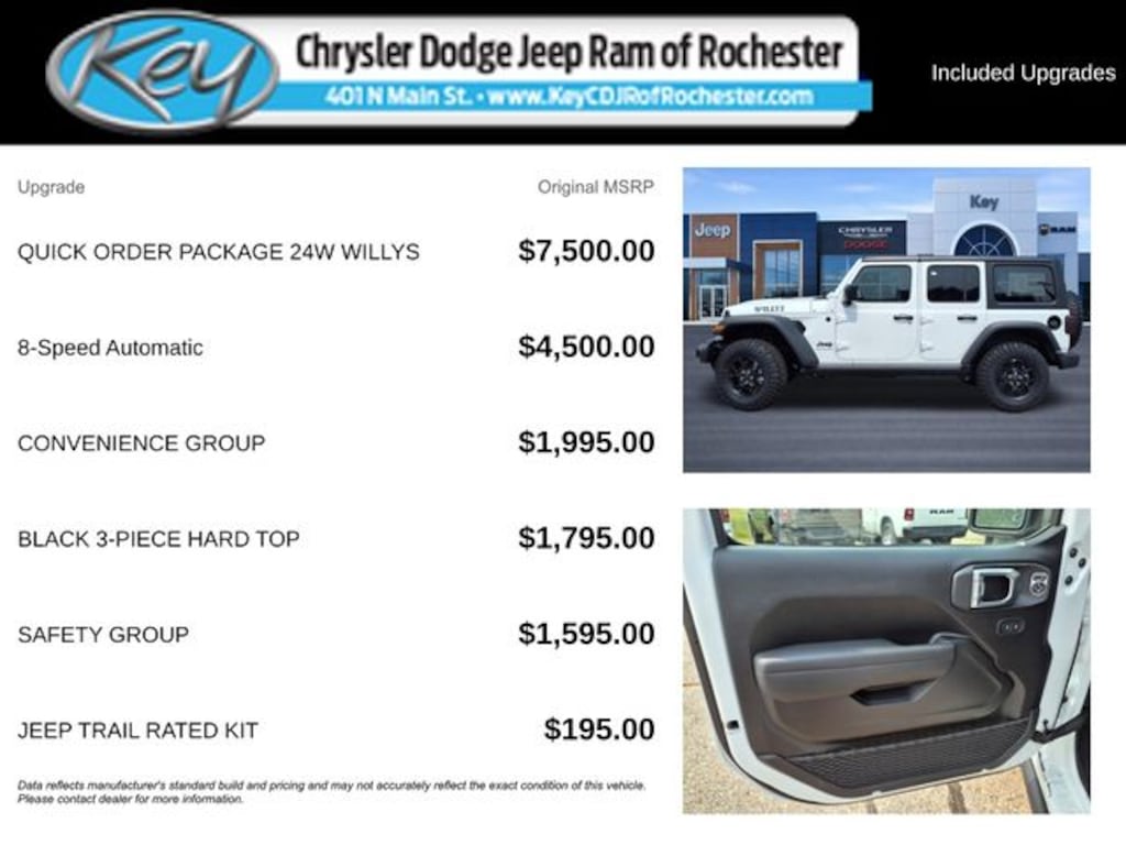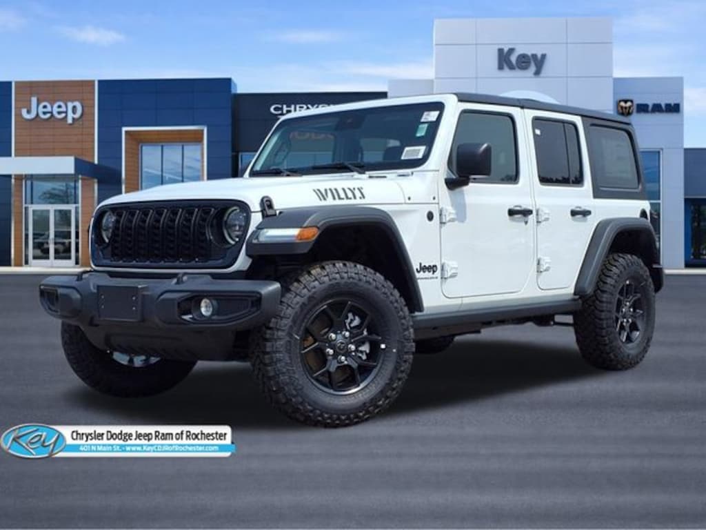 Key Chrysler Dodge Jeep Ram of Rochester is proud to present you with another True Market Priced Vehicle. This 2025 Jeep Wrangler Willys is loaded with the following Factory Options: Convenience Group (2-Door Passive Entry, Front Door Locks, Air Conditioning w/Auto Temperature Control, Air Filtering, Cluster 7.0" TFT Color Display, Emergency/Assistance Call, Heated Front Seats, Heated Steering Wheel, Remote Start System, and Universal Garage Door Opener), Quick Order Package 24W Willys (4-Wheel Drive Swing Gate Decal, 7 & 4 Pin Wiring Harness, 97 MPH Vehicle Max Speed Calibration, Advanced Brake Assist, Automatic Headlamps, Auxiliary Switches, Black Grille, Class II Receiver Hitch, Conventional Differential Front Axle, Corning Gorilla Glass, Dana M210 Wide HD Tube Front Axle, Dana M220 Wide Rear Axle, Daytime Running Lamps LED Accents, Deep Tint Sunscreen Windows, E-Locker Rear Axle, Enhanced Adaptive Cruise Control, Front LED Fog Lamps, Full Speed Forward Collision Warning Plus, Injection Molded Black Rear Bumper, LED Premium Reflector Headlamps, Mold In Color Bumper w/Gloss Black, Molded in Color Rubicon Highline Flare, MOPAR All-Weather Floor Mats, Off-Road Plus Mode, Power Heated Mirrors, Premium Wrapped Steering Wheel, Security Alarm, Sun Visors w/Illuminated Vanity Mirrors, Wheels: 17" x 7.5" Painted Black, Willy's Suspension, and Willys Hood Decal), Safety Group (Auto High Beam Headlamp Control, Blind Spot & Cross Path Detection, LED Taillamps, and ParkSense Rear Park Assist System), 110 MPH Vehicle Max Speed Calibration, 4-Wheel Disc Brakes, 8 Speakers, ABS brakes, Air Conditioning, AM/FM radio: SiriusXM, Apple CarPlay/Android Auto, Aux Battery, Black 3-Piece Hard Top, Brake assist, Cloth Low-Back Bucket Seats, Compass, Delay-off headlights, Driver door bin, Driver vanity mirror, Dual front impact airbags, Dual front side impact airbags, Electronic Stability Control, Freedom Panel Storage Bag, Front anti-roll bar, Front Bucket Seats, Front Center Armrest w/Storage, Front fog lights, Front reading lights, Illuminated entry, Integrated roll-over protection, Jeep Trail Rated Kit, Low tire pressure warning, Non-Lock Fuel Cap w/o Discriminator, Normal Duty Suspension, Occupant sensing airbag, Outside temperature display, Overhead airbag, Panic alarm, ParkView Rear Back-Up Camera, Passenger door bin, Passenger vanity mirror, Power steering, Power windows, Radio data system, Radio: Uconnect 5 w/12.3" Display, Rear anti-roll bar, Rear reading lights, Rear Window Defroster, Rear Window Wiper/Washer, Remote keyless entry, Speed control, Split folding rear seat, Steering wheel mounted audio controls, Stop-Start Dual Battery System, Tachometer, Telescoping steering wheel, Tilt steering wheel, Traction control, Trip computer, Variably intermittent wipers, and Wheels: 17" x 7.5" Black Steel Styled!! Call us to ask about conditional rebates. Price includes: $1500 - 2025 National Bonus Cash . Exp. 03/02/2026 $2000 - 2025 National Select Inventory Bonus Cash. Exp. 03/02/2026 $2500 - 2025 National Retail Bonus Cash . Exp. 03/02/2026