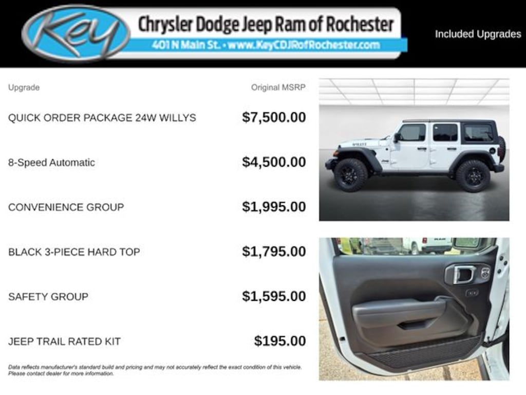 Key Chrysler Dodge Jeep Ram of Rochester is proud to present you with another True Market Priced Vehicle. This 2025 Jeep Wrangler Willys is loaded with the following Factory Options: Convenience Group (2-Door Passive Entry, Front Door Locks, Air Conditioning w/Auto Temperature Control, Air Filtering, Cluster 7.0" TFT Color Display, Emergency/Assistance Call, Heated Front Seats, Heated Steering Wheel, Remote Start System, and Universal Garage Door Opener), Quick Order Package 24W Willys (4-Wheel Drive Swing Gate Decal, 7 & 4 Pin Wiring Harness, 97 MPH Vehicle Max Speed Calibration, Advanced Brake Assist, Automatic Headlamps, Auxiliary Switches, Black Grille, Class II Receiver Hitch, Conventional Differential Front Axle, Corning Gorilla Glass, Dana M210 Wide HD Tube Front Axle, Dana M220 Wide Rear Axle, Daytime Running Lamps LED Accents, Deep Tint Sunscreen Windows, E-Locker Rear Axle, Enhanced Adaptive Cruise Control, Front LED Fog Lamps, Full Speed Forward Collision Warning Plus, Injection Molded Black Rear Bumper, LED Premium Reflector Headlamps, Mold In Color Bumper w/Gloss Black, Molded in Color Rubicon Highline Flare, MOPAR All-Weather Floor Mats, Off-Road Plus Mode, Power Heated Mirrors, Premium Wrapped Steering Wheel, Security Alarm, Sun Visors w/Illuminated Vanity Mirrors, Wheels: 17" x 7.5" Painted Black, Willy's Suspension, and Willys Hood Decal), Safety Group (Auto High Beam Headlamp Control, Blind Spot & Cross Path Detection, LED Taillamps, and ParkSense Rear Park Assist System), 110 MPH Vehicle Max Speed Calibration, 4-Wheel Disc Brakes, 8 Speakers, ABS brakes, Air Conditioning, AM/FM radio: SiriusXM, Apple CarPlay/Android Auto, Aux Battery, Black 3-Piece Hard Top, Brake assist, Cloth Low-Back Bucket Seats, Compass, Delay-off headlights, Driver door bin, Driver vanity mirror, Dual front impact airbags, Dual front side impact airbags, Electronic Stability Control, Freedom Panel Storage Bag, Front anti-roll bar, Front Bucket Seats, Front Center Armrest w/Storage, Front fog lights, Front reading lights, Illuminated entry, Integrated roll-over protection, Jeep Trail Rated Kit, Low tire pressure warning, Non-Lock Fuel Cap w/o Discriminator, Normal Duty Suspension, Occupant sensing airbag, Outside temperature display, Overhead airbag, Panic alarm, ParkView Rear Back-Up Camera, Passenger door bin, Passenger vanity mirror, Power steering, Power windows, Radio data system, Radio: Uconnect 5 w/12.3" Display, Rear anti-roll bar, Rear reading lights, Rear Window Defroster, Rear Window Wiper/Washer, Remote keyless entry, Speed control, Split folding rear seat, Steering wheel mounted audio controls, Stop-Start Dual Battery System, Tachometer, Telescoping steering wheel, Tilt steering wheel, Traction control, Trip computer, Variably intermittent wipers, and Wheels: 17" x 7.5" Black Steel Styled!! Call us to ask about conditional rebates. Price includes: $1500 - 2025 National Bonus Cash . Exp. 01/05/2026 $2000 - 2025 National Holiday Select Inventory Bonus Cash. Exp. 01/05/2026 $2500 - 2025 National Retail Bonus Cash . Exp. 01/05/2026