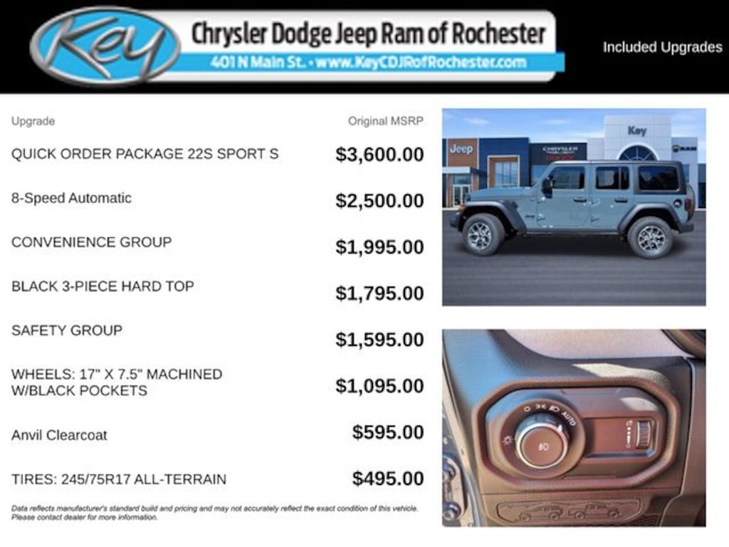 Key Chrysler Dodge Jeep Ram of Rochester is proud to present you with another True Market Priced Vehicle. This 2025 Jeep Wrangler Sport S is loaded with the following Factory Options: Convenience Group (2-Door Passive Entry, Front Door Locks, Air Conditioning w/Auto Temperature Control, Air Filtering, Cluster 7.0" TFT Color Display, Emergency/Assistance Call, Heated Front Seats, Heated Steering Wheel, Remote Start System, and Universal Garage Door Opener), Quick Order Package 22S Sport S (Advanced Brake Assist, Automatic Headlamps, Corning Gorilla Glass, Deep Tint Sunscreen Windows, Enhanced Adaptive Cruise Control, Full Speed Forward Collision Warning Plus, Power Heated Mirrors, Premium Wrapped Steering Wheel, Security Alarm, Sun Visors w/Illuminated Vanity Mirrors, and Wheels: 17" x 7.5" Gray), Safety Group (Auto High Beam Headlamp Control, Blind Spot & Cross Path Detection, Injection Molded Black Rear Bumper, LED Taillamps, and ParkSense Rear Park Assist System), 110 MPH Vehicle Max Speed Calibration, 3.45 Overall Top Gear Ratio, 4-Wheel Disc Brakes, 8 Speakers, ABS brakes, Air Conditioning, AM/FM radio: SiriusXM, Apple CarPlay/Android Auto, Aux Battery, Black 3-Piece Hard Top, Brake assist, Cloth Low-Back Bucket Seats, Compass, Delay-off headlights, Driver door bin, Driver vanity mirror, Dual front impact airbags, Dual front side impact airbags, Electronic Stability Control, Freedom Panel Storage Bag, Front anti-roll bar, Front Bucket Seats, Front Center Armrest w/Storage, Front fog lights, Front reading lights, Illuminated entry, Integrated roll-over protection, Low tire pressure warning, Non-Lock Fuel Cap w/o Discriminator, Normal Duty Suspension, Occupant sensing airbag, Outside temperature display, Overhead airbag, Panic alarm, ParkView Rear Back-Up Camera, Passenger door bin, Passenger vanity mirror, Power steering, Power windows, Radio data system, Radio: Uconnect 5 w/12.3" Display, Rear anti-roll bar, Rear reading lights, Rear Window Defroster, Rear Window Wiper/Washer, Remote keyless entry, Speed control, Split folding rear seat, Steering wheel mounted audio controls, Stop-Start Dual Battery System, Tachometer, Telescoping steering wheel, Tilt steering wheel, Traction control, Trip computer, Variably intermittent wipers, Wheels: 17" x 7.5" Black Steel Styled, and Wheels: 17" x 7.5" Machined w/Black Pockets!! Call us to ask about conditional rebates. Price includes: $1500 - 2025 National Bonus Cash . Exp. 03/02/2026 $2000 - 2025 National Select Inventory Bonus Cash. Exp. 03/02/2026 $2500 - 2025 National Retail Bonus Cash . Exp. 03/02/2026