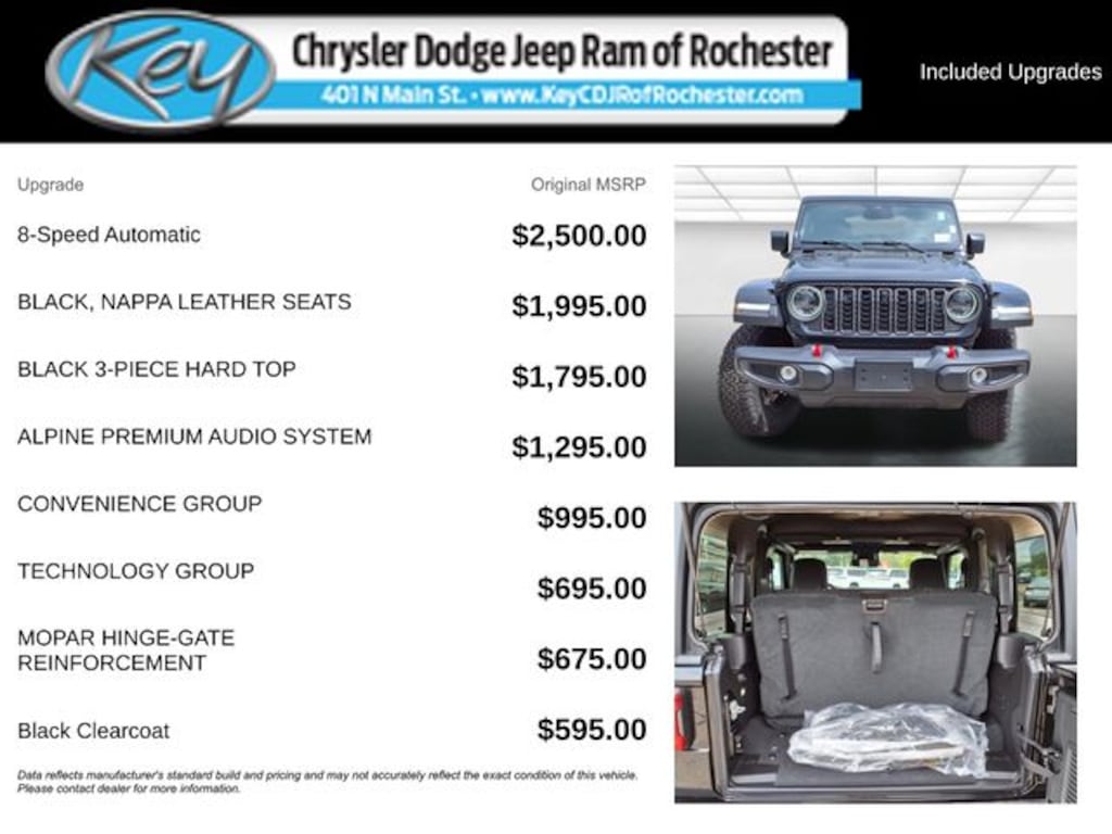 Key Chrysler Dodge Jeep Ram of Rochester is proud to present you with another True Market Priced Vehicle. This 2025 Jeep Wrangler Rubicon is loaded with the following Factory Options: Convenience Group (Heated Front Seats, Heated Steering Wheel, Remote Start System, and Universal Garage Door Opener), Quick Order Package 22R Rubicon, Technology Group (12.3" Touchscreen Display, 4G LTE Wi-Fi Hot Spot, Apple CarPlay, Auto-Dimming Rear-View Mirror, Connected Travel & Traffic Services, Connectivity - US/Canada, Google Android Auto, GPS Navigation, HD Radio, Integrated Off-Road Camera, Integrated Voice Command w/Bluetooth, Radio: Uconnect 5 Nav w/12.3" Display, SiriusXM Radio Service, and SiriusXM w/360L), 4-Wheel Disc Brakes, 4.10 Rear Axle Ratio, 8 Speakers, 97 MPH Vehicle Max Speed Calibration, ABS brakes, Air Conditioning, Alloy wheels, Alpine Premium Audio System, AM/FM radio: SiriusXM with 360L, Apple CarPlay/Android Auto, Automatic temperature control, Aux Battery, Auxiliary Switches, Black 3-Piece Hard Top, Body Color Rubicon Highline Flare, Brake assist, Class II Receiver Hitch, Cloth Low-Back Bucket Seats, Compass, Delay-off headlights, Driver door bin, Driver vanity mirror, Dual front impact airbags, Dual front side impact airbags, Electronic Stability Control, Emergency communication system: Jeep Connect, Freedom Panel Storage Bag, Front anti-roll bar, Front Bucket Seats, Front Center Armrest w/Storage, Front dual zone A/C, Front fog lights, Front License Plate Bracket (DISC), Front reading lights, Fully automatic headlights, Heated door mirrors, Illuminated entry, Integrated roll-over protection, Low tire pressure warning, MOPAR All-Weather Floor Mats, MOPAR Hinge-Gate Reinforcement, Non-Lock Fuel Cap w/o Discriminator, Occupant sensing airbag, Outside temperature display, Overhead airbag, Panic alarm, ParkView Rear Back-Up Camera, Passenger door bin, Passenger vanity mirror, Performance Suspension, Power door mirrors, Power steering, Power windows, Radio data system, Radio: Uconnect 5 w/12.3" Display, Rear anti-roll bar, Rear reading lights, Rear Window Defroster, Rear Window Wiper/Washer, Remote keyless entry, Security system, Speed control, Steering wheel mounted audio controls, Stop-Start Dual Battery System, Tachometer, Telescoping steering wheel, Tilt steering wheel, Traction control, Trip computer, Variably intermittent wipers, Voltmeter, and Wheels: 17" x 7.5" Machined/Painted Black!! Call us to ask about conditional rebates. Price includes: $2000 - 2025 National Retail Bonus Cash . Exp. 01/05/2026