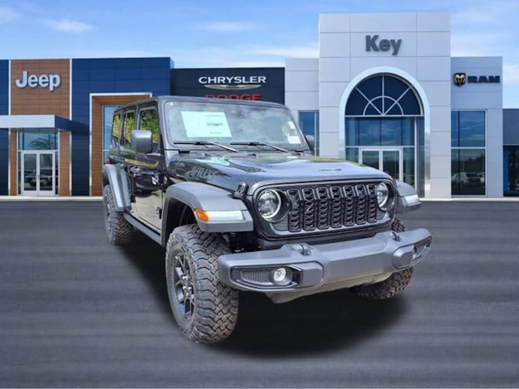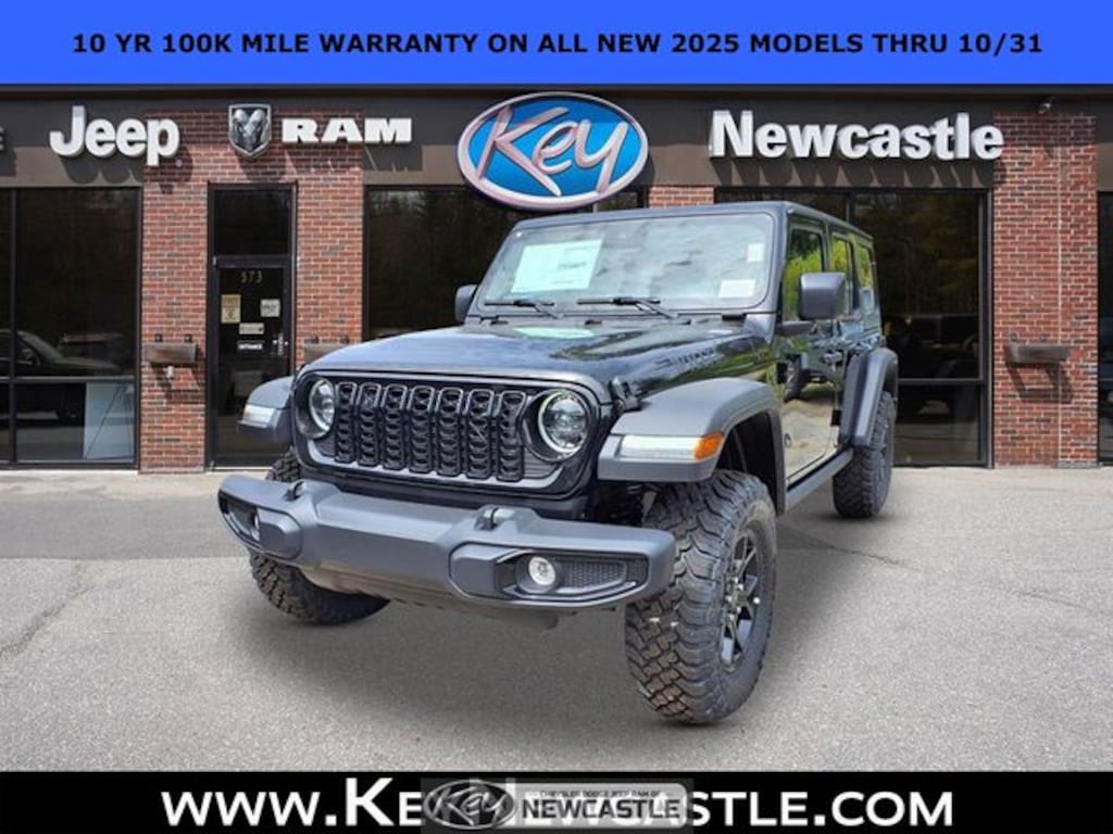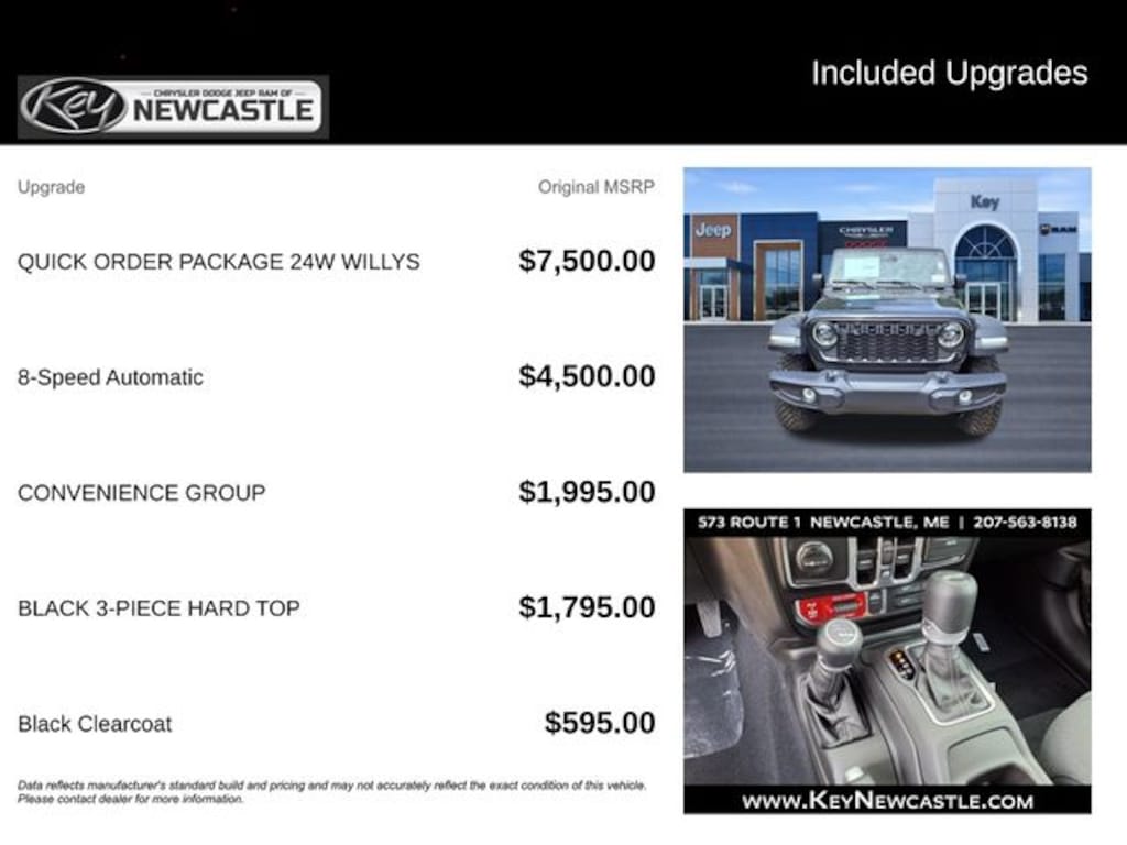 Key Chrysler Dodge Jeep Ram Newcastle is proud to present you with another True Market Priced Vehicle. This 2025 Jeep Wrangler Willys is loaded with the following Factory Options: Convenience Group (2-Door Passive Entry, Front Door Locks, Air Conditioning w/Auto Temperature Control, Air Filtering, Cluster 7.0" TFT Color Display, Emergency/Assistance Call, Heated Front Seats, Heated Steering Wheel, Remote Start System, and Universal Garage Door Opener), Quick Order Package 24W Willys (4-Wheel Drive Swing Gate Decal, 4.10 Rear Axle Ratio, 7 & 4 Pin Wiring Harness, 97 MPH Vehicle Max Speed Calibration, Advanced Brake Assist, Automatic Headlamps, Auxiliary Switches, Black Grille, Class II Receiver Hitch, Conventional Differential Front Axle, Corning Gorilla Glass, Dana M210 Wide HD Tube Front Axle, Dana M220 Wide Rear Axle, Daytime Running Lamps LED Accents, Deep Tint Sunscreen Windows, E-Locker Rear Axle, Enhanced Adaptive Cruise Control, Front LED Fog Lamps, Full Speed Forward Collision Warning Plus, Injection Molded Black Rear Bumper, LED Premium Reflector Headlamps, Mold In Color Bumper w/Gloss Black, Molded in Color Rubicon Highline Flare, MOPAR All-Weather Floor Mats, Off-Road Plus Mode, Power Heated Mirrors, Premium Wrapped Steering Wheel, Security Alarm, Sun Visors w/Illuminated Vanity Mirrors, Wheels: 17" x 7.5" Painted Black, Willy's Suspension, and Willys Hood Decal), 110 MPH Vehicle Max Speed Calibration, 3.45 Overall Top Gear Ratio, 4-Wheel Disc Brakes, 8 Speakers, ABS brakes, Air Conditioning, AM/FM radio: SiriusXM, Apple CarPlay/Android Auto, Aux Battery, Black 3-Piece Hard Top, Brake assist, Cloth Low-Back Bucket Seats, Compass, Delay-off headlights, Driver door bin, Driver vanity mirror, Dual front impact airbags, Dual front side impact airbags, Electronic Stability Control, Freedom Panel Storage Bag, Front anti-roll bar, Front Bucket Seats, Front Center Armrest w/Storage, Front fog lights, Front reading lights, Illuminated entry, Integrated roll-over protection, Low tire pressure warning, Non-Lock Fuel Cap w/o Discriminator, Normal Duty Suspension, Occupant sensing airbag, Outside temperature display, Overhead airbag, Panic alarm, ParkView Rear Back-Up Camera, Passenger door bin, Passenger vanity mirror, Power steering, Power windows, Radio data system, Radio: Uconnect 5 w/12.3" Display, Rear anti-roll bar, Rear reading lights, Rear Window Defroster, Rear Window Wiper/Washer, Remote keyless entry, Speed control, Split folding rear seat, Steering wheel mounted audio controls, Stop-Start Dual Battery System, Tachometer, Telescoping steering wheel, Tilt steering wheel, Traction control, Trip computer, Variably intermittent wipers, and Wheels: 17" x 7.5" Black Steel Styled!!