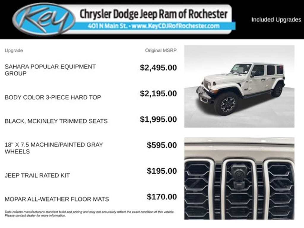Key Chrysler Dodge Jeep Ram of Rochester is proud to present you with another True Market Priced Vehicle. This 2026 Jeep Wrangler Sahara is loaded with the following Factory Options: Quick Order Package 22G, Sahara Popular Equipment Group (12.3" Touchscreen Display, 4G LTE Wi-Fi Hot Spot, Alpine Premium Audio System, Apple CarPlay, Auto High Beam Headlamp Control, Auto-Dimming Rear-View Mirror, Blind Spot and Cross Path Detection, Connected Travel and Traffic Services, Connectivity - US/Canada, For More Info, Call 800-643-2112, Google Android Auto, GPS Navigation, Hard Seat Back, HD Radio, Integrated Center Stack Radio, Integrated Off-Road Camera, Integrated Voice Command with Bluetooth, Leather Wrapped Park Brake Handle, Leather Wrapped Shift Knob, McKinley Trimmed Seats, ParkSense Rear Park Assist System, Power 4-Way Driver Lumbar Adjust, Power 4-Way Passenger Lumbar Adjust, Power Adjust 8-Way Driver Seat, Power Adjust 8-Way Front Passenger Seat, Radio: Uconnect 5 Navigation with 12.3" Display, Side Steps, SiriusXM Radio Service, SiriusXM with 360L, and Universal Garage Door Opener), 3.45 Overall Top Gear Ratio, 4-Wheel Disc Brakes, 8 Speakers, ABS brakes, Air Conditioning, Alloy wheels, AM/FM radio: SiriusXM with 360L, Apple CarPlay/Android Auto, Automatic temperature control, Aux Battery, Body Color 3-Piece Hard Top, Brake assist, Cloth Low-Back Bucket Seats, Compass, Delay-off headlights, Driver door bin, Driver vanity mirror, Dual front impact airbags, Dual front side impact airbags, Electronic Stability Control, Emergency communication system: Jeep Connect, Freedom Panel Storage Bag, Front anti-roll bar, Front Bucket Seats, Front Center Armrest w/Storage, Front dual zone A/C, Front fog lights, Front License Plate Bracket, Front reading lights, Fully automatic headlights, Heated door mirrors, Heated front seats, Heated steering wheel, Heavy Duty Suspension with Gas Shocks, Illuminated entry, Integrated roll-over protection, Jeep Trail Rated Kit, Low tire pressure warning, MOPAR All-Weather Floor Mats, No Soft Top, Non-Lock Fuel Cap Without Discriminator, Occupant sensing airbag, Outside temperature display, Overhead airbag, Panic alarm, ParkView Rear Back-Up Camera, Passenger door bin, Passenger vanity mirror, Power door mirrors, Power steering, Power windows, Radio data system, Radio: Uconnect 5 with 12.3" Display, Rear anti-roll bar, Rear reading lights, Rear Window Defroster, Rear Window Wiper/Washer, Remote keyless entry, Security system, Speed control, Split folding rear seat, Steering wheel mounted audio controls, Stop-Start Dual Battery System, Tachometer, Telescoping steering wheel, Tilt steering wheel, Traction control, Trip computer, Variably intermittent wipers, Voltmeter, Wheels: 18" x 7.5 Machine/Painted Gray, and Wheels: 18" x 7.5" Machine/Painted Gray!! Call us to ask about conditional rebates. Price includes: $1000 - 2026 National Retail Bonus Cash . Exp. 04/30/2026 $1500 - 2026 National Select Inventory Bonus Cash . Exp. 01/04/2027