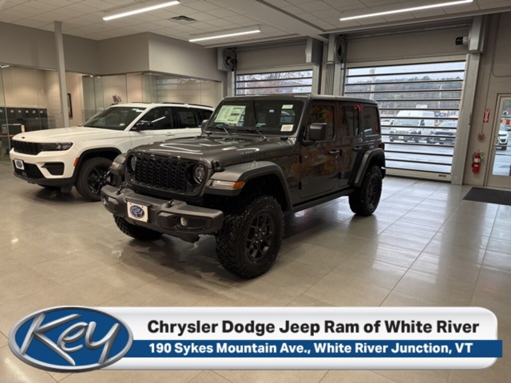 Key Chrysler Dodge Jeep Ram of White River is proud to present you with another True Market Priced Vehicle. This 2026 Jeep Wrangler Willys is loaded with the following Factory Options: Convenience Group (2-Door Passive Entry, Front Door Locks, Air Conditioning w/Auto Temperature Control, Air Filtering, Cluster 7.0" TFT Color Display, Emergency/Assistance Call, Heated Front Seats, Heated Steering Wheel, Remote Start System, and Universal Garage Door Opener), Quick Order Package 22W Willys (4-Wheel Drive Swing Gate Decal, 7 & 4 Pin Wiring Harness, Advanced Brake Assist, Automatic Headlamps, Auxiliary Switches, Black Grille, Class II Receiver Hitch, Conventional Differential Front Axle, Corning Gorilla Glass, Dana M210 Wide HD Tube Front Axle, Dana M220 Wide Rear Axle, Daytime Running Lamps LED Accents, Deep Tint Sunscreen Windows, E-Locker Rear Axle, Enhanced Adaptive Cruise Control, Front LED Fog Lamps, Full Speed Forward Collision Warning Plus, Injection Molded Black Rear Bumper, LED Premium Reflector Headlamps, Mold In Color Bumper w/Gloss Black, Molded in Color Rubicon Highline Flare, MOPAR All-Weather Floor Mats, Off-Road Plus Mode, Power Heated Mirrors, Premium Wrapped Steering Wheel, Security Alarm, Sun Visors w/Illuminated Vanity Mirrors, Wheels: 17" x 7.5" Painted Black, Willy's Suspension, and Willys Hood Decal), 4-Wheel Disc Brakes, 8 Speakers, ABS brakes, Air Conditioning, AM/FM radio: SiriusXM with 360L, Apple CarPlay/Android Auto, Aux Battery, Black 3-Piece Hard Top, Brake assist, Cloth Low-Back Bucket Seats, Compass, Delay-off headlights, Driver door bin, Driver vanity mirror, Dual front impact airbags, Dual front side impact airbags, Electronic Stability Control, Freedom Panel Storage Bag, Front anti-roll bar, Front Bucket Seats, Front Center Armrest w/Storage, Front fog lights, Front reading lights, Illuminated entry, Integrated roll-over protection, Jeep Trail Rated Kit, Low tire pressure warning, Non-Lock Fuel Cap w/o Discriminator, Normal Duty Suspension, Occupant sensing airbag, Outside temperature display, Overhead airbag, Panic alarm, ParkView Rear Back-Up Camera, Passenger door bin, Passenger vanity mirror, Power steering, Power windows, Radio data system, Radio: Uconnect 5 w/12.3" Display, Rear anti-roll bar, Rear reading lights, Rear Window Defroster, Rear Window Wiper/Washer, Remote keyless entry, Speed control, Split folding rear seat, Steering wheel mounted audio controls, Stop-Start Dual Battery System, Tachometer, Telescoping steering wheel, Tilt steering wheel, Traction control, Trip computer, Variably intermittent wipers, and Wheels: 17" x 7.5" Black Steel Styled!!
