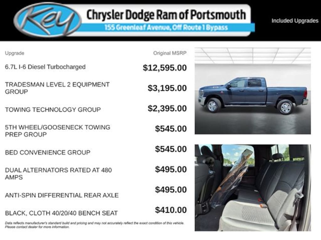 Key Chrysler Dodge Ram of Portsmouth is proud to present you with another True Market Priced Vehicle. This 2025 Ram 2500 Tradesman is loaded with the following Factory Options: Bed Convenience Group (LED Bed Lighting and MOPAR Spray In Bedliner), Quick Order Package 24A Tradesman, Towing Technology Group (Auto Power-Folding Mirrors, Black Exterior Mirrors, Blind Spot & Cross Path Detection, CTR Stop Lamp w/Cargo View Camera, Exterior Mirrors Courtesy Lamps, Exterior Mirrors w/Heating Element, Exterior Mirrors w/Supplemental Signals, Forward & Reverse Utility Lights, LED Tail Lamps, Mirror Running Lights, Power Adjust Mirrors, Power Adjustable Convex Aux Mirrors, Power Heated Folding Telescopic Mirrors, Power Telescoping Mirrors, Red Tail Lamp Bezels, Surround View Camera System, Trailer Reverse Guidance, and Trailer Tire Pressure Monitoring System), Tradesman Level 2 Equipment Group (115V Auxiliary Front Power Outlet, 12" Touchscreen Display, 2 Way Rear Headrest Seat, 4 Way Front Headrests, 40/20/40 Split Bench Seat, 400W Inverter, 4G LTE Wi-Fi Hot Spot, Air Conditioning ATC w/Dual Zone Control, Alexa Built-In, Anti-Spin Differential Rear Axle, Apple CarPlay, Auto-Dimming Rear-View Mirror, Bright Front Bumper, Bright Rear Bumper, Carpet Floor Covering, Center Hub, Chrome Grille Surround, Cloth 40/20/40 Bench Seat, Connected Travel & Traffic Services, Connectivity - US/Canada, Disassociated Touchscreen Display, Emergency Vehicle Alert System (EVAS), Exterior 115V AC Outlet, Front & Rear Floor Mats, Front Armrest w/Cupholders, Global Telematics Box Module (TBM), Google Android Auto, GPS Antenna Input, GPS Navigation, HD Radio, Integrated Voice Command w/Bluetooth, Manual Adjust 4-Way Driver Seat, Manual Adjust 4-Way Front Passenger Seat, Manual Folding Exterior Mirrors, Manual Telescoping Mirrors, Matte Black Mesh Grille w/Chrome, Mopar Black Tubular Side Steps, Off-Road Info Pages, ParkSense Front/Rear Park Assist System, Power Heated Folding Telescope Mirrors, Radio: Uconnect 5 Nav w/12.0" Display, Rear Folding Seat, Rear Power Sliding Window, Remote USB Port - Charge Only, Selectable Tire Fill Alert, SiriusXM Radio Service, SiriusXM w/360L, Storage Tray, Tinted Acoustic Windshield Glass, Trailer Tow Pages, and Wheels: 18" x 8.0" Steel Chrome Clad), 4-Wheel Disc Brakes, 5th Wheel/Gooseneck Towing Prep Group, 6 Speakers, ABS brakes, Air Conditioning, AM/FM radio: SiriusXM, Apple CarPlay/Android Auto, Black Wheel Center Hub, Brake assist, Clearance Lamps, Compass, Delay-off headlights, Driver door bin, Dual Alternators Rated at 480 Amps, Dual front impact airbags, Dual front side impact airbags, Electronic Stability Control, Front anti-roll bar, Front Center Armrest w/Storage, Front fog lights, Front License Plate Bracket, Front reading lights, Fully automatic headlights, Heavy Duty Vinyl 40/20/40 Split Bench Seat, Illuminated entry, Low tire pressure warning, Manufacturer's Statement of Origin, MOPAR