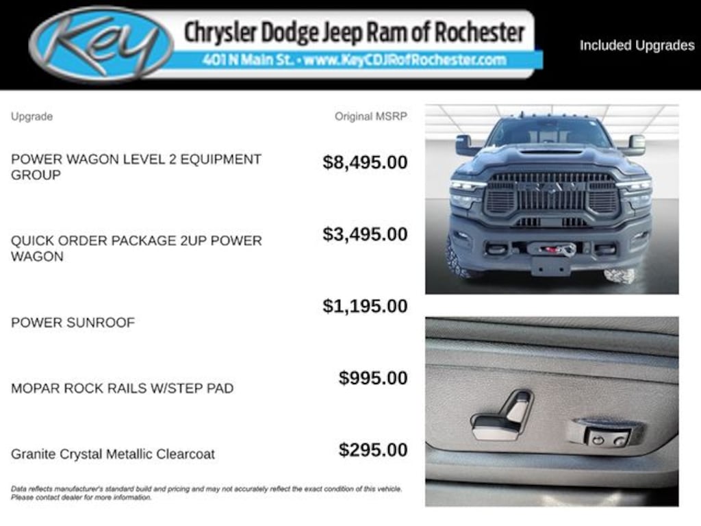 Key Chrysler Dodge Jeep Ram of Rochester is proud to present you with another True Market Priced Vehicle. This 2025 Ram 2500 Rebel is loaded with the following Factory Options: Power Wagon Level 2 Equipment Group (115V Auxiliary Rear Power Outlet, 14.4" Touchscreen Display, 17 Speaker harman/kardon Premium Sound, 2 Way Rear Headrest Seat, 4 Way Front Headrests, 4G LTE Wi-Fi Hot Spot, Alexa Built-In, Aluminum Litho Instrument Panel Bezels w/Blk Trim, Apple CarPlay, Auto Adjust In Reverse Exterior Mirrors, Auto Dim Exterior Mirror, Auto High Beam Headlamp Control, Auto Power-Folding Mirrors, Auto-Dimming Exterior Passenger Mirror, Black Exterior Mirrors, Body Color Door Handles, Bucket Seats, Connected Travel & Traffic Services, Connectivity - US/Canada, CTR Stop Lamp w/Cargo View Camera, Disassociated Touchscreen Display, Dual Wireless Charging Pad, Emergency Vehicle Alert System (EVAS), Exterior Mirrors Courtesy Lamps, Exterior Mirrors w/Heating Element, Exterior Mirrors w/Memory, Exterior Mirrors w/Supplemental Signals, Folding Flat Load Floor Storage, Forward & Reverse Utility Lights, Front Door Locks 2-Door Passive Entry, Front Electric Winch, Front Passenger Interactive Display, Front Seat Back Map Pockets, Full Length Upgraded Floor Console, Global Telematics Box Module (TBM), Google Android Auto, GPS Antenna Input, GPS Navigation, HD Radio, Heated Front Seats, Heated Second Row Seats, Heated Steering Wheel, High Back Seats, Integrated Voice Command w/Bluetooth, Leather Trimmed Bucket Seats (GL), Leather Wrapped Grab Handle, Leather Wrapped Shift Control, LED Bed Lighting, LED Dome Lamp w/On/Off Switch, LED Interior Lighting, Media Hub w/2 Charge Only USBs, Mirror Running Lights, MOPAR Deployable Bed Step, MOPAR Front & Rear Rubber Floor Mats, MOPAR Spray In Bedliner, Off-Road Info Pages, Overhead LED Lamps, Power 2-Way Driver Lumbar Adjust, Power 2-Way Passenger Lumbar Adjust, Power Adjust 8-Way Driver Seat, Power Adjust 8-Way Front Passenger Seat, Power Adjust Mirrors, Power Adjustable Convex Aux Mirrors, Power Adjustable Pedals w/Memory, Power Heated Fold Telescopic Mirrors w/Memory, Power Telescoping Mirrors, Premium Overhead Console, Radio: Uconnect 5 Nav w/14.4" Display, Radio/Driver Seat/Mirrors/Pedals Memory, Rain Sensitive Windshield Wipers, Rear 60/40 Folding Seat, Selectable Tire Fill Alert, SiriusXM Radio Service, SiriusXM w/360L, Sport Performance Hood, Sun Visors w/Illuminated Vanity Mirrors, Trailer Tow Pages, Universal Garage Door Opener, and Ventilated Front Seats), Power Wagon Off-Road Group, Quick Order Package 2UP Power Wagon (Black Wheel Center Hub, Front Disconnecting Stabilizer Bar, Power Wagon Instrument Cluster Theme 5, Power Wagon Instrument Panel Spec Plate, Raised Ride Height, RAM Articulink Suspension, Tru-Lok Front & Rear Axles, and Wheels: 17" x 8.0" Black Painted Aluminum), 4-Wheel Disc Brakes, 6 Speakers, ABS brakes, Adjustable pedals, Air Conditioning, Alloy wheels, AM/FM radio: SiriusXM with 360L, Apple CarPlay/Android Auto, Auto-dimming Rear-View mirror, Automatic temper Call us to ask about conditional rebates. Price includes: $2000 - 2025 National Bonu