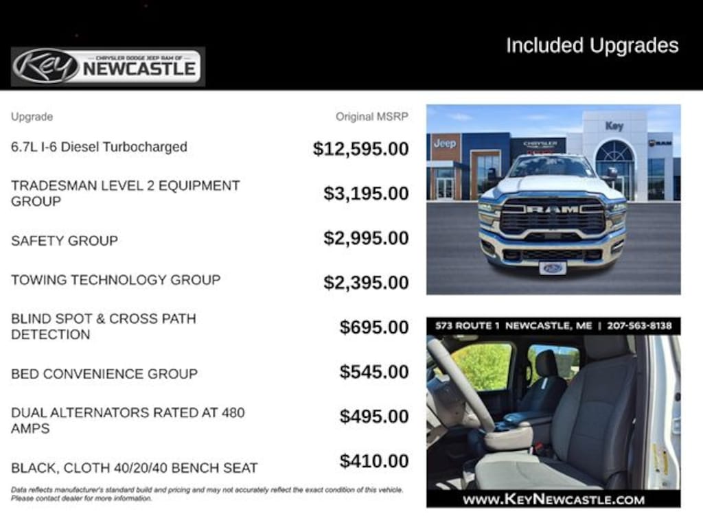Key Chrysler Dodge Jeep Ram Newcastle is proud to present you with another True Market Priced Vehicle. This 2025 Ram 3500 Tradesman is loaded with the following Factory Options: Cold Weather Group (Engine Block Heater and MOPAR Winter Front Grille Cover), Quick Order Package 24A Tradesman, Safety Group (Active Lane Management System, Adaptive Steering System, Auto High Beam Headlamp Control, Auto-Dimming Rear-View Mirror, Cluster 7.0" TFT Color Display, Drowsy Driver Detection, Luxury Steering Wheel, Rain Sensitive Windshield Wipers, Steering Wheel Mounted Audio Controls, and Traffic Sign Recognition), Towing Technology Group (Auto Power-Folding Mirrors, Black Exterior Mirrors, Blind Spot & Cross Path Detection, CTR Stop Lamp w/Cargo View Camera, Exterior Mirrors Courtesy Lamps, Exterior Mirrors w/Heating Element, Exterior Mirrors w/Supplemental Signals, Forward & Reverse Utility Lights, LED Tail Lamps, Mirror Running Lights, Power Adjust Mirrors, Power Heated Fold Tel