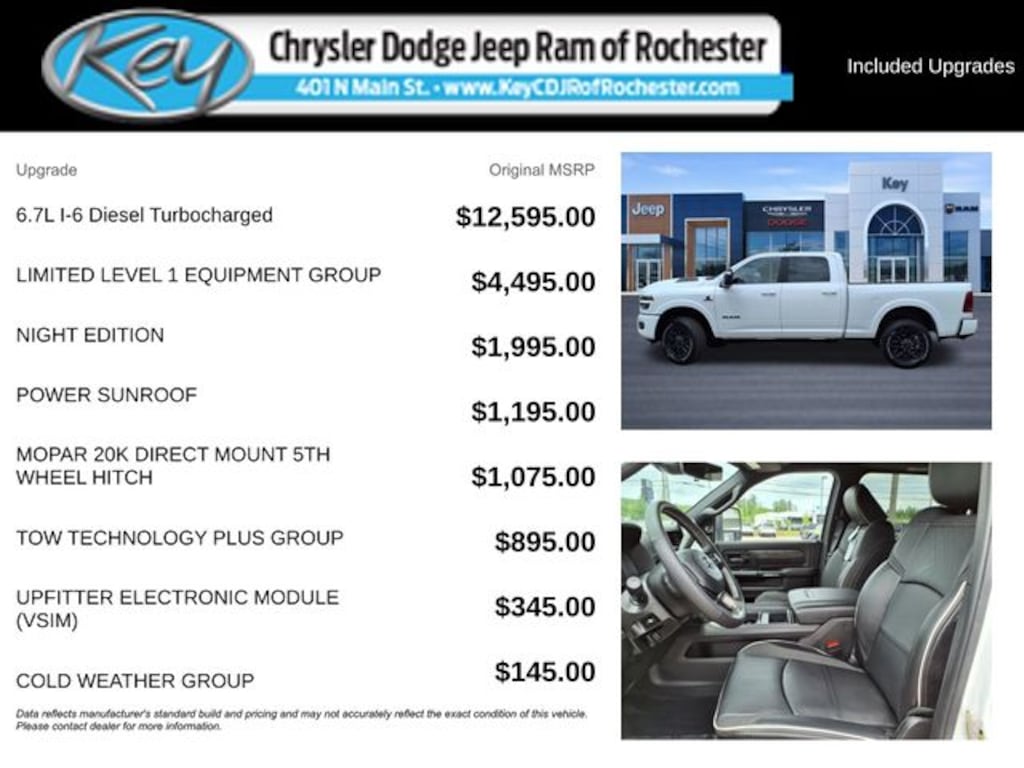 Key Chrysler Dodge Jeep Ram of Rochester is proud to present you with another True Market Priced Vehicle. This 2025 Ram 3500 Limited is loaded with the following Factory Options: 5th Wheel/Gooseneck Towing Prep Group (Pickup Box, Vendor Painted Cargo Box, and Vendor Painted Cargo Box Tracking), Cold Weather Group (Engine Block Heater and MOPAR Winter Front Grille Cover), Limited Level 1 Equipment Group (Active Lane Management System, Adaptive Steering System, CTR Stop Lamp w/Cargo View Camera, Digital Rearview Mirror, Drowsy Driver Detection, LED Bed Lighting, MOPAR Spray In Bedliner, Power Deployable Running Boards, Surround View Camera System, Traffic Sign Recognition, Trailer Reverse Guidance, and Trailer Tire Pressure Monitoring System), Night Edition (Black Exterior Truck Badging, Black Limited Grille, Black Wheel Center Hub, Body Color Grille Surround, Sport Performance Hood, and Wheels: 20" x 8.0" Night Edition Black Aluminum), Quick Order Package 24M Limited, Tow Technology Plus Group (Auxiliary Switches Prep, Digital 3.0 Rear View Auto Dimming Mirror, and Trailer Reverse Steering Control), and Navigation System 5th Wheel/Gooseneck Towing Prep Group (Pickup Box, Vendor Painted Cargo Box, and Vendor Painted Cargo Box Tracking), Cold Weather Group (Engine Block Heater and MOPAR Winter Front Grille Cover), Limited Level 1 Equipment Group (Active Lane Management System, Adaptive Steering System, CTR Stop Lamp w/Cargo View Camera, Digital Rearview Mirror, Drowsy Driver Detection, LED Bed Lighting, MOPAR Spray In Bedliner, Power Deployable Running Boards, Surround View Camera System, Traffic Sign Recognition, Trailer Reverse Guidance, and Trailer Tire Pressure Monitoring System), Night Edition (Black Exterior Truck Badging, Black Limited Grille, Black Wheel Center Hub, Body Color Grille Surround, Sport Performance Hood, and Wheels: 20" x 8.0" Night Edition Black Aluminum), Quick Order Package 24M Limited, Tow Technology Plus Group (Auxiliary Switches Prep, Digital 3.0 Rear View Auto Dimming Mirror, and Trailer Reverse Steering Control), Navigation System, 115V Auxiliary Rear Power Outlet, 17 Speakers, 2 W Call us to ask about conditional rebates. Price includes: $2000 - 2025 National Bonu