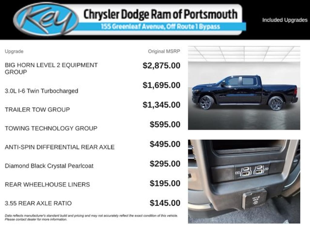 Key Chrysler Dodge Ram of Portsmouth is proud to present you with another True Market Priced Vehicle. This 2026 Ram 1500 Big Horn/Lone Star is loaded with the following Factory Options: Big Horn Level 2 Equipment Group (115V Auxiliary Power Outlet, 115V Auxiliary Rear Power Outlet, 12" Touchscreen Display, 3 Rear Seat Head Restraints, 4 Way Front Headrests, 400W Inverter, 4G LTE Wi-Fi Hot Spot, Apple CarPlay, Auto Power-Folding Mirrors, Auto-Dimming Exterior Driver Mirror, Auto-Dimming Rear-View Mirror, Black Exterior Mirrors, Black Premium Power Mirrors, Body Color Fender Flares, Bucket Seats, Center Console Parts Module, Cluster 7.0" TFT Color Display, Configurable Drive Mode, Connectivity - US/Canada, Convex Wide-Angle Exterior Mirror Insert, Deluxe Cloth Bucket Seats, Disassociated Touchscreen Display, Exterior Mirrors Courtesy Lamps, Front Seat Back Map Pockets, Full Length Floor Console, Glove Box Lamp, Google Android Auto, GPS Antenna Input, GPS Navigation, HD Radio, Heated Front Seats, Heated Steering Wheel, Integrated Center Stack Radio, Leather Wrapped Steering Wheel, LED Footwell Lighting, Manual Adjust 4-Way Front Passenger Seat, Overhead LED Lamps, Power 2-Way Driver Lumbar Adjust, Power Adjust 8-Way Driver Seat, Power Adjustable Pedals, Premium Overhead Console, Rear 60/40 Folding Seat, Rear Center Armrest, Rear Power Sliding Window, Rear Window Defroster, Remote Tailgate Release, Security Alarm, SiriusXM Radio Service, Steering Wheel Mounted Audio Controls, Universal Garage Door Opener, and USB Host Flip), Night Edition (Accent Color Door Handles, Accent Color Premium Power Mirrors, Accent Color Tailgate Handle, Anti-Spin Differential Rear Axle, Black Exterior Truck Badging, Black Headlamp Bezels, Black Interior Accents, Black Painted Exterior Mirrors Caps, Black Tail Lamp Bezels, Body Color Front Bumper, Grille Black Surround Black Mesh, RAM Grille Badge - Black, and Wheels: 20" x 9.0" Aluminum Painted Clad), Quick Order Package 21Z Big Horn, Towing Technology Group (Trailer Hitch Line-Up Assist), 4-Wheel Disc Brakes, 48V Belt Starter Generator, 6 Speakers, ABS brakes, Air Conditioning, Alloy wheels, AM/FM radio, Apple CarPlay/Android Auto, Auto High-beam Headlights, Black Trailer Tow Power Mirrors, Brake assist, Bumpers: chrome, Cloth Bucket Seats, Compass, Delay-off headlights, Driver door bin, Dual front impact airbags, Dual front side impact airbags, Electronic Stability Control, Front anti-roll bar, Front Bucket Seats, Front Center Armrest w/Storage, Front fog lights, Front License Plate Bracket, Front reading lights, Front wheel independent suspension, Fully automatic headlights, Heated door mirrors, Illuminated entry, Low tire pressure warning, Manual Adjust 4-Way Driver Seat, Manual Folding Exterior Mirrors, Manufacturer's Statement of Origin, Mirror Clearance/Running Lights, Mopar Black Tubular Side Steps, Occupant sensing airbag, Outside temperature displ