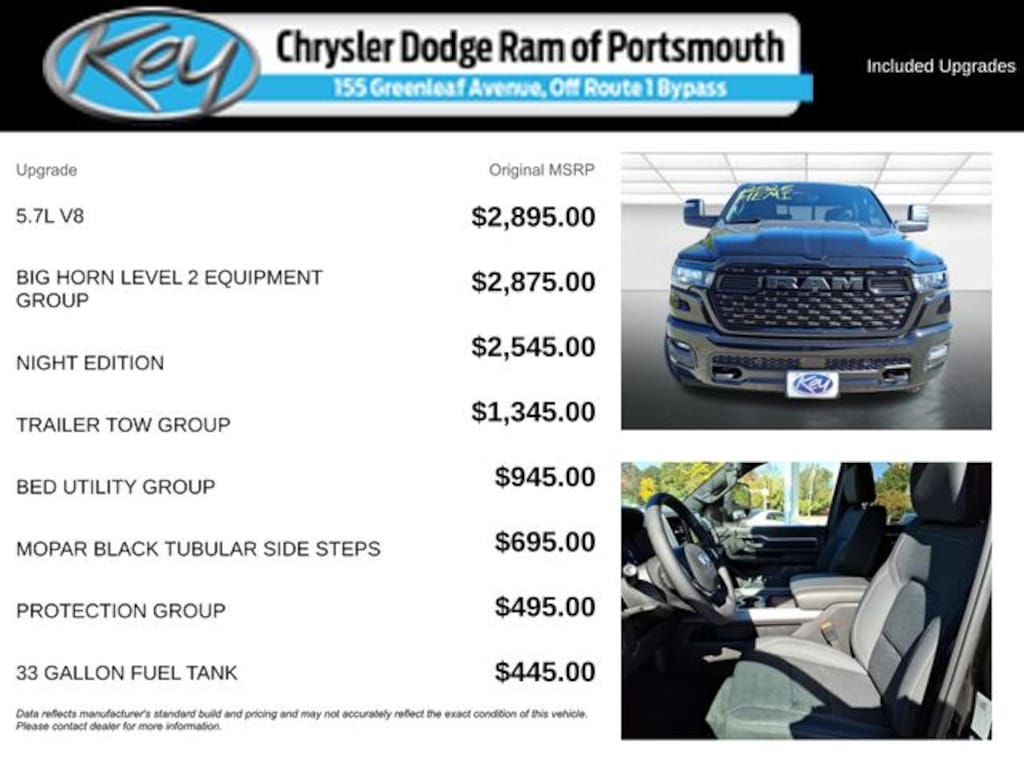 Key Chrysler Dodge Ram of Portsmouth is proud to present you with another True Market Priced Vehicle. This 2026 Ram 1500 Big Horn/Lone Star is loaded with the following Factory Options: Bed Utility Group (Exterior 115V AC Outlet, MOPAR 4 Adjustable Cargo Tie-Down Hooks, and Pick-Up Box Lighting), Big Horn Level 2 Equipment Group (115V Auxiliary Power Outlet, 115V Auxiliary Rear Power Outlet, 12" Touchscreen Display, 3 Rear Seat Head Restraints, 4 Way Front Headrests, 400W Inverter, 4G LTE Wi-Fi Hot Spot, Apple CarPlay, Auto Power-Folding Mirrors, Auto-Dimming Exterior Driver Mirror, Auto-Dimming Rear-View Mirror, Black Exterior Mirrors, Black Premium Power Mirrors, Body Color Fender Flares, Bucket Seats, Center Console Parts Module, Cluster 7.0" TFT Color Display, Configurable Drive Mode, Connectivity - US/Canada, Convex Wide-Angle Exterior Mirror Insert, Deluxe Cloth Bucket Seats, Disassociated Touchscreen Display, Exterior Mirrors Courtesy Lamps, Front Seat Back Map Pockets, Full Length Floor Console, Glove Box Lamp, Google Android Auto, GPS Antenna Input, GPS Navigation, HD Radio, Heated Front Seats, Heated Steering Wheel, Integrated Center Stack Radio, Leather Wrapped Steering Wheel, LED Footwell Lighting, Manual Adjust 4-Way Front Passenger Seat, Overhead LED Lamps, Power 2-Way Driver Lumbar Adjust, Power Adjust 8-Way Driver Seat, Power Adjustable Pedals, Premium Overhead Console, Rear 60/40 Folding Seat, Rear Center Armrest, Rear Power Sliding Window, Rear Window Defroster, Remote Tailgate Release, Security Alarm, SiriusXM Radio Service, Steering Wheel Mounted Audio Controls, Universal Garage Door Opener, and USB Host Flip), Night Edition (Accent Color Door Handles, Accent Color Premium Power Mirrors, Accent Color Tailgate Handle, Anti-Spin Differential Rear Axle, Black Exterior Truck Badging, Black Headlamp Bezels, Black Interior Accents, Black Painted Exterior Mirrors Caps, Black Tail Lamp Bezels, Body Color Front Bumper, Grille Black Surround Black Mesh, RAM Grille Badge - Black, and Wheels: 20" x 9.0" Aluminum Painted Clad), Protection Group (Tow Hooks), Quick Order Package 27Z Big Horn, 33 Gallon Fuel Tank, 4-Wheel Disc Brakes, 48V Belt Starter Generator, 6 Speakers, ABS brakes, Air Conditioning, Alloy wheels, AM/FM radio, Apple CarPlay/Android Auto, Auto High-beam Headlights, Black Trailer Tow Power Mirrors, Brake assist, Bumpers: chrome, Cloth Bucket Seats, Compass, Delay-off headlights, Driver door bin, Dual front impact airbags, Dual front side impact airbags, Electronic Stability Control, Front anti-roll bar, Front Bucket Seats, Front Center Armrest w/Storage, Front fog lights, Front License Plate Bracket, Front reading lights, Front wheel independent suspension, Fully automatic headlights, Heated door mirrors, Illuminated entry, Low tire pressure warning, Manual Adjust 4-Way Driver Seat, Manual Folding Exterior Mirrors, Manufact