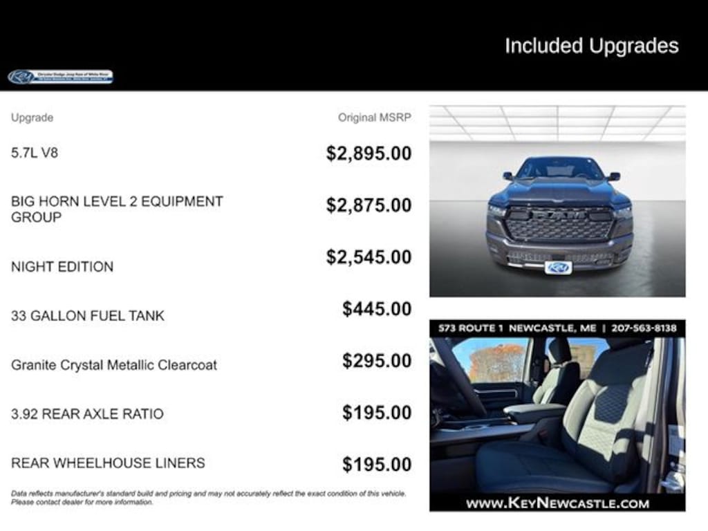Key Chrysler Dodge Jeep Ram of White River is proud to present you with another True Market Priced Vehicle. This 2026 Ram 1500 Big Horn/Lone Star is loaded with the following Factory Options: Big Horn Level 2 Equipment Group (115V Auxiliary Power Outlet, 115V Auxiliary Rear Power Outlet, 12" Touchscreen Display, 2nd Row In Floor Storage Bins, 3 Rear Seat Head Restraints, 4 Way Front Headrests, 400W Inverter, 4G LTE Wi-Fi Hot Spot, 9 Amplified Speakers w/Subwoofer, Air Conditioning ATC w/Dual Zone Control, Apple CarPlay, Auto Power-Folding Mirrors, Auto-Dimming Exterior Driver Mirror, Auto-Dimming Rear-View Mirror, Black Exterior Mirrors, Black Premium Power Mirrors, Body Color Fender Flares, Bucket Seats, Center Console Parts Module, Cluster 7.0" TFT Color Display, Configurable Drive Mode, Connected Travel & Traffic Services, Connectivity - US/Canada, Convex Wide-Angle Exterior Mirror Insert, Deluxe Cloth Bucket Seats, Disassociated Touchscreen Display, Exterior Mirrors Courtesy Lamps, Exterior Mirrors w/Heating Element, Exterior Mirrors w/Supplemental Signals, Front Seat Back Map Pockets, Full Length Floor Console, Global Telematics Box Module (TBM), Glove Box Lamp, Google Android Auto, GPS Antenna Input, GPS Navigation, HD Radio, Heated Front Seats, Heated Steering Wheel, Integrated Center Stack Radio, Integrated Voice Command w/Bluetooth, Leather Wrapped Steering Wheel, LED Dome Lamp w/On/Off Switch, LED Footwell Lighting, Manual Adjust 4-Way Front Passenger Seat, Media Hub w/2 Charge Only USBs, Overhead LED Lamps, Power 2-Way Driver Lumbar Adjust, Power Adjust 8-Way Driver Seat, Power Adjustable Pedals, Premium Overhead Console, Radio: Uconnect 5 Nav w/12.0" Display, Rear 60/40 Folding Seat, Rear Center Armrest, Rear Power Sliding Window, Rear Window Defroster, Remote Tailgate Release, Security Alarm, SiriusXM Radio Service, SiriusXM w/360L, Steering Wheel Mounted Audio Controls, Sun Visors w/Illuminated Vanity Mirrors, Universal Garage Door Opener, USB Host Flip, and Wheels: 20" x 9" Aluminum Chrome Clad (WRK)), Night Edition (Accent Color Door Handles, Accent Color Premium Power Mirrors, Accent Color Tailgate Handle, Anti-Spin Differential Rear Axle, Black Exterior Truck Badging, Black Headlamp Bezels, Black Interior Accents, Black Painted Exterior Mirrors Caps, Black Tail Lamp Bezels, Body Color Front Bumper, Body Color Rear Bumper w/Step Pads, Dual Exhaust w/Black Tips, Grille Black Surround Black Mesh, RAM Grille Badge - Black, and Wheels: 20" x 9.0" Aluminum Painted Clad), Quick Order Package 27Z Big Horn, 33 Gallon Fuel Tank, 4-Wheel Disc Brakes, 48V Belt Starter Generator, 6 Speakers, ABS brakes, Air Conditioning, Alloy wheels, AM/FM radio, Apple CarPlay/Android Auto, Auto High-beam Headlights, Brake assist, Bumpers: chrome, Cloth Bucket Seats, Compass, Delay-off headlights, Driver door bin, Dual front impact airbags, Dual front side impact airbags, Electronic Stability Control, Front anti-roll bar, Front Bucket Seats, Front Center Armrest w/Storage, Front fog lights, Front License Plate Bracket, Front reading lights, Front wheel independent suspension, Fully auto