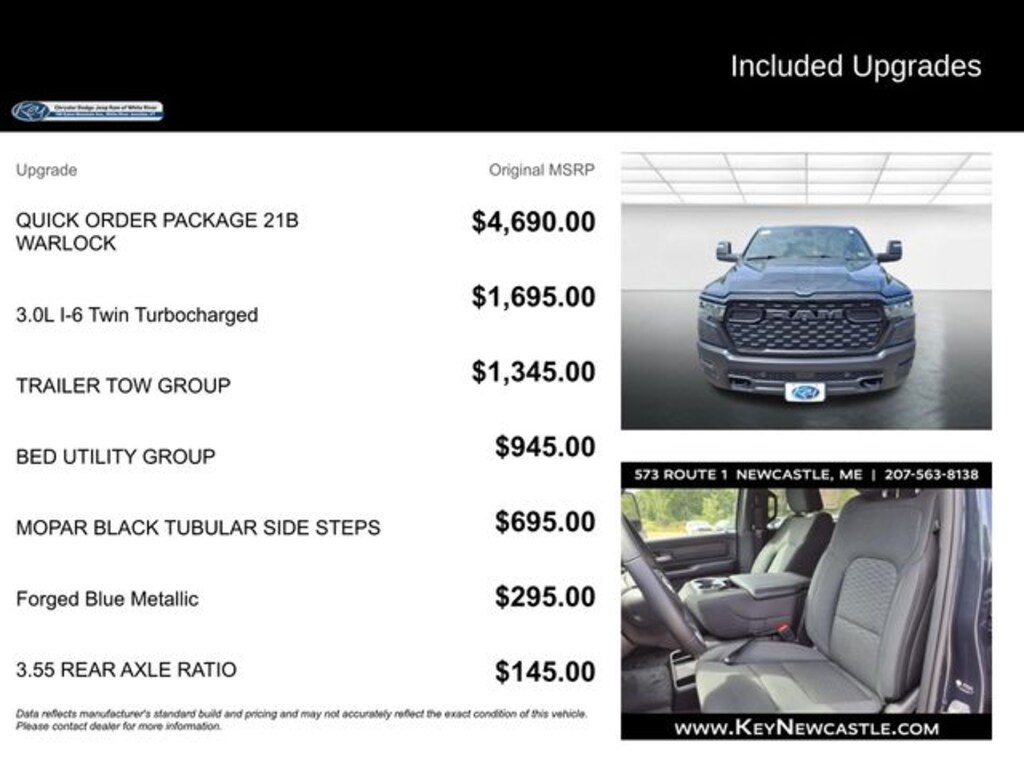 Key Chrysler Dodge Jeep Ram of White River is proud to present you with another True Market Priced Vehicle. This 2026 Ram 1500 Warlock is loaded with the following Factory Options: Bed Utility Group (400W Inverter, Exterior 115V AC Outlet, MOPAR 4 Adjustable Cargo Tie-Down Hooks, MOPAR Deployable Bed Step, MOPAR Spray In Bedliner, and Pick-Up Box Lighting), Quick Order Package 21B Warlock (115V Auxiliary Power Outlet, Cluster 7.0" TFT Color Display, E-Locker Rear Axle, Front LED Fog Lamps, Front Performance Tuned Shock Absorbers, MOPAR Front & Rear Rubber Floor Mats, Raised Ride Height, Rear Performance Tuned Shock Absorbers, Selec-Speed Control, Tow Hooks, Warlock Decal, and Wheels: 18" x 8.0" Black Painted Aluminum), Tradesman Level 1 Equipment Group (2nd Row In Floor Storage Bins, Cloth Bench Seat, Front & Rear Floor Mats, Rear Power Sliding Window, SiriusXM Radio Service, and SiriusXM Satellite Radio), Trailer Tow Group (DISC) (Accent Color Tailgate Handle, Black Exterior Mirrors, Black Trailer Tow Power Mirrors, Exterior Mirrors Courtesy Lamps, Exterior Mirrors w/Heating Element, Exterior Mirrors w/Supplemental Signals, Manual Folding Exterior Mirrors, Manual Telescoping Mirrors, Mirror Clearance/Running Lights, Power-Adjustable Convex Aux Mirrors, Trailer Brake Control, Trailer Reverse Steering Control, Trailer Tire Pressure Monitoring System, and Trailer Tow Mirrors), 4 Way Front Headrests, 4-Wheel Disc Brakes, 48V Belt Starter Generator, 4G LTE Wi-Fi Hot Spot, 6 Speakers, ABS brakes, Air Conditioning, AM/FM radio, Apple CarPlay, Apple CarPlay/Android Auto, Auto High-beam Headlights, Brake assist, Compass, Connectivity - US/Canada, Delay-off headlights, Driver door bin, Dual front impact airbags, Dual front side impact airbags, Electronic Stability Control, For Details Visit DriveUconnect.com, Front anti-roll bar, Front Center Armrest, Front License Plate Bracket, Front reading lights, Front wheel independent suspension, Fully automatic headlights, Global Telematics Box Module (TBM), Google Android Auto, GPS Antenna Input, Heated door mirrors, Heavy Duty Vinyl 40/20/40 Split Bench Seat, Illuminated entry, Integrated Center Stack Radio, Integrated Voice Command w/Bluetooth, Low tire pressure warning, Manual Adjust 4-Way Driver Seat, Manual Adjust 4-Way Front Passenger Seat, Manufacturer's Statement of Origin, Mopar Black Tubular Side Steps, Occupant sensing airbag, Outside temperature display, Overhead airbag, Overhead console, Panic alarm, ParkView Rear Back-Up Camera, Passenger door bin, Passenger vanity mirror, Power door mirrors, Power steering, Power windows, Radio data system, Radio: Uconnect 5 W w/8.4" Display, Rear anti-roll bar, Rear Folding Seat, Rear step bumper, Remote keyless entry, Speed control, Supplier Part Tracking (J-1), Tachometer, Telescoping steering wheel, Tilt steering wheel, Traction control, USB Host Flip, Variably intermittent wipers, Voltmeter, and Wheels: 18" x 7.5" Steel Painted!!
