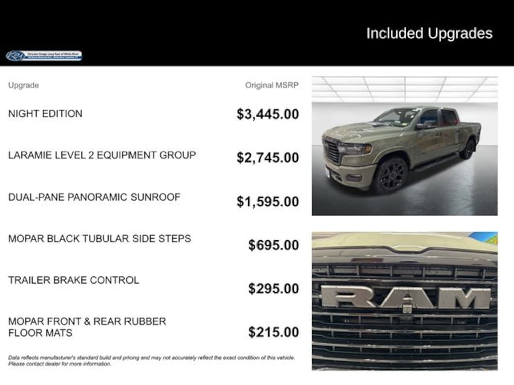 Key Chrysler Dodge Jeep Ram of White River is proud to present you with another True Market Priced Vehicle. This 2026 Ram 1500 Laramie is loaded with the following Factory Options: Laramie Level 2 Equipment Group (14.4" Touchscreen Display, 4G LTE Wi-Fi Hot Spot, Cluster 12" TFT Color Display, Connected Travel and Traffic Services, Connectivity - US/Canada, Front Passenger Interactive Display, GPS Navigation, Harman/Kardon 19 Speaker Premium Sound, Integrated Center Stack Radio, Integrated Voice Command with Bluetooth, Power Tailgate, Radio: Uconnect 5 Nav with 14.4" Display, Rain Sensitive Windshield Wipers, SiriusXM Radio Service, SiriusXM with 360L, and USB Host Flip), Night Edition (Accent Color Door Handles, Accent Color Premium Power Mirrors, Accent Color Tailgate Handle, Anti-Spin Differential Rear Axle, Auto Power-Folding Mirrors, Auto-Dimming Exterior Driver Mirror, Black Exterior Truck Badging, Black Headlamp Bezels, Black Interior Accents, Black Painted Exterior Mirrors Caps, Black Tail Lamp Bezels, Body Color Front Bumper, Body Color Rear Bumper with Step Pads, Convex Wide-Angle Exterior Mirror Insert, Dual Exhaust with Black Tips, Exterior Mirrors Approach Lamps, Exterior Mirrors Courtesy Lamps, Exterior Mirrors with Heating Element, Exterior Mirrors with Memory, Exterior Mirrors with Supplemental Signals, Grille Surround 3 Black Texture 2 Black, Pirelli Brand Tires, Proximity Approach/Departure Lamps, RAM Grille Badge - Black, Sport Performance Hood, and Wheels: 22" x 9" Forged Aluminum), Quick Order Package 21H Laramie, 10 Speakers, 3.55 Rear Axle Ratio, 4-Wheel Disc Brakes, ABS brakes, Active Noise Control System, Air Conditioning, Alloy wheels, AM/FM radio: SiriusXM with 360L, Apple CarPlay/Android Auto, Audio memory, Auto High-beam Headlights, Auto-dimming door mirrors, Auto-dimming Rear-View mirror, Automatic temperature control, Brake assist, Bumpers: chrome, Chrome Exterior Mirrors, Compass, Delay-off headlights, Dome Dual LED Reading Lamp, Driver door bin, Driver vanity mirror, Dual front impact airbags, Dual front side impact airbags, Dual-Pane Panoramic Sunroof, Electronic Stability Control, Front anti-roll bar, Front Bucket Seats, Front Center Armrest w/Storage, Front dual zone A/C, Front fog lights, Front License Plate Bracket, Front reading lights, Front wheel independent suspension, Fully automatic headlights, Garage door transmitter, Heated door mirrors, Heated front seats, Heated rear seats, Heated steering wheel, Illuminated entry, Leather steering wheel, Leather Trimmed Bucket Seats, LED Dome/Reading Lamp, Low tire pressure warning, Manufacturer's Statement of Origin, Memory seat, Mopar Black Tubular Side Steps, MOPAR Front and Rear Rubber Floor Mats, Navigation System, Occupant sensing airbag, Off-Road Information Pages, Outside temperature display, Overhead airbag, Overhead console, Panic alarm, ParkView Rear Back-Up Camera, Passenger door bin, Passenger vanity mirror, Power door mirrors, Power driver seat, Power passenger seat, Power steering, Power windows, Radio data system, Radio: Uconnect 5 Navigation with 12.0" Display, RAM Grille Badge - Chrome, Rear anti-ro