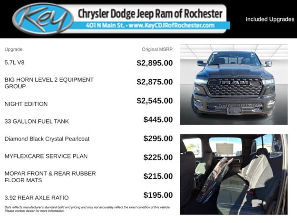 Key Chrysler Dodge Jeep Ram of Rochester is proud to present you with another True Market Priced Vehicle. This 2026 Ram 1500 Big Horn/Lone Star is loaded with the following Factory Options: Big Horn Level 2 Equipment Group (115V Auxiliary Power Outlet, 115V Auxiliary Rear Power Outlet, 12" Touchscreen Display, 2nd Row in Floor Storage Bins, 3 Rear Seat Head Restraints, 4 Way Front Headrests, 400W Inverter, 4G LTE Wi-Fi Hot Spot, 9 Amplified Speakers with Subwoofer, Air Conditioning ATC with Dual Zone Control, Apple CarPlay, Auto Power-Folding Mirrors, Auto-Dimming Exterior Driver Mirror, Auto-Dimming Rear-View Mirror, Black Exterior Mirrors, Black Premium Power Mirrors, Body Color Fender Flares, Bucket Seats, Center Console Parts Module, Cluster 7.0" TFT Color Display, Configurable Drive Mode, Connected Travel and Traffic Services, Connectivity - US/Canada, Convex Wide-Angle Exterior Mirror Insert, Deluxe Cloth Bucket Seats, Disassociated Touchscreen Display, Exterior Mirrors Courtesy Lamps, Exterior Mirrors with Heating Element, Exterior Mirrors with Supplemental Signals, Front Seat Back Map Pockets, Full Length Floor Console, Global Telematics Box Module, Glove Box Lamp, Google Android Auto, GPS Antenna Input, GPS Navigation, HD Radio, Heated Front Seats, Heated Steering Wheel, Integrated Center Stack Radio, Integrated Voice Command with Bluetooth, Leather Wrapped Steering Wheel, LED Dome Lamp with on/Off Switch, LED Footwell Lighting, Manual Adjust 4-Way Front Passenger Seat, Media Hub with 2 Charge Only USBs, Overhead LED Lamps, Power 2-Way Driver Lumbar Adjust, Power Adjust 8-Way Driver Seat, Power Adjustable Pedals, Premium Overhead Console, Radio: Uconnect 5 Navigation with 12.0" Display, Rear 60/40 Folding Seat, Rear Center Armrest, Rear Power Sliding Window, Rear Window Defroster, Remote Tailgate Release, Security Alarm, SiriusXM Radio Service, SiriusXM with 360L, Steering Wheel Mounted Audio Controls, Sun Visors with Illuminated Vanity Mirrors, Universal Garage Door Opener, and USB Host Flip), Night Edition (Accent Color Door Handles, Accent Color Premium Power Mirrors, Accent Color Tailgate Handle, Anti-Spin Differential Rear Axle, Black Exterior Truck Badging, Black Headlamp Bezels, Black Interior Accents, Black Painted Exterior Mirrors Caps, Black Tail Lamp Bezels, Body Color Front Bumper, Body Color Rear Bumper with Step Pads, Dual Exhaust with Black Tips, Grille Black Surround Black Mesh, RAM Grille Badge - Black, and Wheels: 20" x 9.0" Aluminum Painted Clad), Quick Order Package 27Z Big Horn, 33 Gallon Fuel Tank, 4-Wheel Disc Brakes, 48V Belt Starter Generator, 6 Speakers, ABS brakes, Air Conditioning, Alloy wheels, AM/FM radio, Apple CarPlay/Android Auto, Auto High-beam Headlights, Brake assist, Bumpers: chrome, Cloth Bucket Seats, Compass, Delay-off headlights, Driver door bin, Dual front impact airbags, Dual front side impact airbags, Electronic Stability Control, Front anti-roll bar, Front Bucket Seats, Front Center Armrest w Call us to ask about conditional rebates. Price includes: $3500 - 2026 National Retail Consume