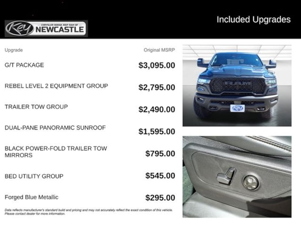 Key Chrysler Dodge Jeep Ram of Rochester is proud to present you with another True Market Priced Vehicle. This 2026 Ram 1500 Rebel is loaded with the following Factory Options: Bed Utility Group (Exterior 115V AC Outlet, MOPAR 4 Adjustable Cargo Tie-Down Hooks, and MOPAR Spray In Bedliner), G/T Package (4 Way Front Headrests, Bucket Seats, Driver Seat Memory, Floor Console, Front Seat Back Map Pockets, G/T Decal, G/T Exhaust, GT Interior Theme, Heated Front Seats, Heated Second Row Seats, Heated Steering Wheel, Leather Wrapped Shift Knob, Leather-Wrapped Steering Wheel, Leather/Vinyl Bucket Seats, MOPAR Bright Pedal Kit, Performance Pages, Power 4-Way Driver Lumbar Adjust, Power 4-Way Passenger Lumbar Adjust, Power Adjust 8-Way Driver Seat, Power Adjust 8-Way Front Passenger Seat, Rear 60/40 Folding Split Recline Seat, Steering Wheel Mounted Shift Control, Under Seat Lighting, and Ventilated Front Seats), Quick Order Package 21W Rebel, Rebel Level 2 Equipment Group (115V Auxiliary Rear Power Outlet, 14.4" Touchscreen Display, 2-Door Passive Entry, Front Door Locks, 4G LTE Wi-Fi Hot Spot, Accent Color Door Handles, Accent Color Premium Power Mirrors, Accent Color Tailgate Handle, Apple CarPlay, Auto Power-Folding Mirrors, Auto-Dimming Exterior Driver Mirror, Black Painted Exterior Mirrors Caps, Connected Travel & Traffic Services, Connectivity - US/Canada, Convex Wide-Angle Exterior Mirror Insert, Disassociated Touchscreen Display, Dual Wireless Charging Pad, Exterior Mirrors Approach Lamps, Exterior Mirrors Courtesy Lamps, Exterior Mirrors w/Heating Element, Exterior Mirrors w/Memory, Exterior Mirrors w/Supplemental Signals, Front Passenger Interactive Display, Global Telematics Box Module (TBM), Google Android Auto, GPS Antenna Input, GPS Navigation, harman/kardon 19 Speaker Premium Sound, HD Radio, Integrated Center Stack Radio, Integrated Voice Command w/Bluetooth, Media Hub w/2 Charge Only USBs, Off-Road Information Pages, Power 2-Way Passenger Lumbar Adjust, Power Adjustable Pedals w/Memory, Power Tailgate, Proximity Approach/Departure Lamps, Radio: Uconnect 5 Nav w/14.4" Display, Radio/Driver Seat/Mirrors/Pedals Memory, Rain Sensitive Windshield Wipers, Rear Window Defroster, Security Alarm, SiriusXM Radio Service, SiriusXM w/360L, Smartphone As A Key Capable, and USB Host Flip), Trailer Tow Group (DISC) (Trailer Brake Control, Trailer Light Check, Trailer Reverse Steering Control, and Trailer Tire Pressure Monitoring System), 10 Speakers, 3.92 Rear Axle Ratio, 4-Wheel Disc Brakes, ABS brakes, Active Noise Control System, Air Conditioning, Alloy wheels, AM/FM radio: SiriusXM with 360L, Apple CarPlay/Android Auto, Auto High-beam Headlights, Auto-Dimming Exterior Passenger Mirror, Auto-dimming Rear-View mirror, Automatic temperature control, Black Exterior Mirrors, Black Power-Fold Trailer Tow Mirrors, Brake assist, Cloth/Vinyl Bucket Seats, Compass, Delay-off headlights, Dome Dual LED Reading Lamp, Driver door bin, Driver vanity mirror, Call us to ask about conditional rebates. Price includes: $2000 - 2026 National Holiday Select Inventory Bonus Cash. Exp. 12/01/2025 $3500 - 2026 National Retail Consume