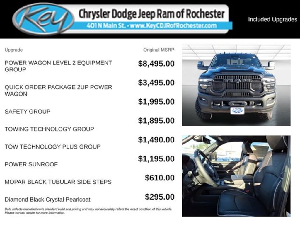 Key Chrysler Dodge Jeep Ram of Rochester is proud to present you with another True Market Priced Vehicle. This 2026 Ram 2500 Rebel is loaded with the following Factory Options: Power Wagon Level 2 Equipment Group (14.4" Touchscreen Display, 17 Speaker Harman/Kardon Premium Sound, 2 Way Rear Headrest Seat, 4 Way Front Headrests, 4G LTE Wi-Fi Hot Spot, Alexa Built-in, Aluminum Litho Instrument Panel Bezels with Black Trim, Apple CarPlay, Auto Adjust in Reverse Exterior Mirrors, Auto Dim Exterior Mirror, Auto High Beam Headlamp Control, Auto Power-Folding Mirrors, Auto-Dimming Exterior Passenger Mirror, Black Exterior Mirrors, Body Color Door Handles, Center Stop Lamp with Cargo View Camera, Connected Travel and Traffic Services, Connectivity - US/Canada, Disassociated Touchscreen Display, Emergency Vehicle Alert System (EVAS), Exterior Mirrors Courtesy Lamps, Exterior Mirrors with Heating Element, Exterior Mirrors with Memory, Exterior Mirrors with Supplemental Signals, Folding Flat Load Floor Storage, For Details, Visit DriveUconnect.com, For More Info, Call 800-643-2112, Forward and Reverse Utility Lights, Front Door Locks 2-Door Passive Entry, Front Electric Winch, Front Passenger Interactive Display, Global Telematics Box Module, Google Android Auto, GPS Antenna Input, GPS Navigation, HD Radio, Heated Front Seats, Heated Steering Wheel, High Back Seats, Integrated Voice Command with Bluetooth, Leather Wrapped Grab Handle, Leather Wrapped Shift Control, LED Bed Lighting, LED Dome Lamp with on/Off Switch, LED Interior Lighting, Mirror Running Lights, MOPAR Deployable Bed Step, MOPAR Front and Rear Rubber Floor Mats, MOPAR Spray in Bedliner, Off-Road Info Pages, Overhead LED Lamps, Power 2-Way Driver Lumbar Adjust, Power Adjust 8-Way Driver Seat, Power Adjust Mirrors, Power Adjustable Pedals with Memory, Power Heated Fold Telescopic Mirrors with Memory, Power Telescoping Mirrors, Power-Adjustable Convex Aux Mirrors, Premium Overhead Console, Radio: Uconnect 5 Nav with 14.4" Display, Rain Sensitive Windshield Wipers, Rear 60/40 Folding Seat, Selectable Tire Fill Alert, SiriusXM Radio Service, SiriusXM with 360L, Sport Performance Hood, Sun Visors with Illuminated Vanity Mirrors, Trailer Tow Pages, and Universal Garage Door Opener), Quick Order Package 2UP Power Wagon (Black Wheel Center Hub, Front Disconnecting Stabilizer Bar, Instrument Cluster Theme 5 - Power Wagon, Power Wagon Instrument Panel Spec Plate, Raised Ride Height, RAM Articulink Suspension, Tru-Lok Front and Rear Axles, and Wheels: 17" x 8.0" Black Painted Aluminum), Safety Group (Active Lane Management System, Adaptive Steering System, Drowsy Driver Detection, and Traffic Sign Recognition), Tow Technology Plus Group (Digital 3.0 Rear View Auto Dimming Mirror and Trailer Reverse Steering Control), Towing Technology Group (Surround View Camera System, Trailer Reverse Guidance, and Trailer Tire Pressure Monitoring System), 4-Wheel Disc Brakes, 6 Speakers, ABS brakes, Adjustable pe Call us to ask about conditional rebates. Price includes: $1000 - 2026 National Bonus Cash . Exp. 01/05/2026 $2000 - 2026 National Holiday Select Inventory Bon