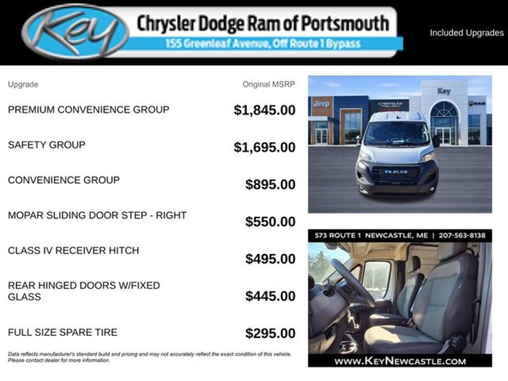 Key Chrysler Dodge Ram of Portsmouth is proud to present you with another True Market Priced Vehicle. This 2026 Ram ProMaster 2500 High Roof is loaded with the following Factory Options: Convenience Group (Exterior Mirrors with Heating Element, Exterior Mirrors with Supplemental Signals, Front Fog Lamps, Power Adjust Mirrors, Power Folding/Heated Mirrors, Power-Adjustable Convex Aux Mirrors, Power-Folding Mirrors, and Rear Cargo LED Lamp), Premium Convenience Group (10.1" Touchscreen Display, 4G LTE Wi-Fi Hotspot, Apple CarPlay, Connected Travel and Traffic Services, Connectivity - US/Canada, Disassociated Touchscreen Display, For Details, Visit DriveUconnect.com, For More Info, Call 800-643-2112, Global Telematics Box Module, Google Android Auto, GPS Antenna Input, GPS Navigation, HD Radio, Integrated Center Stack Radio, Integrated Voice Command with Bluetooth, Passive Entry, Radio: Uconnect 5 Nav with 10.1" Display, SiriusXM Radio Service, SiriusXM with 360L, Traffic Sign Information, and Wireless Charging Pad), Quick Order Package 22B Tradesman (4-Way Manual Adjust Front Passenger Seat and Passenger Bucket Seat), Safety Group (Blind Spot and Cross Path Detection, Digital Rearview Mirror with Autodim, Intelligent Speed Assist (ISA), Lane Departure Warning Plus, and ParkSense Front/Rear Park Assist System), 4 Speakers, 4-Wheel Disc Brakes, 4.08 Axle Ratio, ABS brakes, Adaptive Cruise Control with Stop and Go, Air Conditioning, AM/FM radio: SiriusXM, Apple CarPlay/Android Auto, Black/Gray Seats, Bodyside moldings, Brake assist, Class IV Receiver Hitch, Cloth Bucket Seats, Deep Tint Sunscreen Glass, Driver door bin, Driver Seat Armrest, Driver's Seat Mounted Armrest, Electronic Stability Control, Front anti-roll bar, Front Bucket Seats, Front License Plate Bracket, Front reading lights, Front wheel independent suspension, Heavy Duty Suspension, Illuminated entry, Low tire pressure warning, Manufacturer's Statement of Origin, MOPAR Sliding Door Step - Right, Outside temperature display, Overhead airbag, Overhead console, ParkView Rear Back-Up Camera, Passenger door bin, Power steering, Power windows, Radio: Uconnect 5 with 7" Display, Rear Hinged Doors with Fixed Glass, Rear View Day/Night Mirror, Rear Window Defroster, Remote keyless entry, Steering wheel mounted audio controls, Tachometer, Telescoping steering wheel, Traction control, Trip computer, Turn signal indicator mirrors, Variably intermittent wipers, Wheel Center Cap, and Wheels: 16" x 6.0" Steel!!