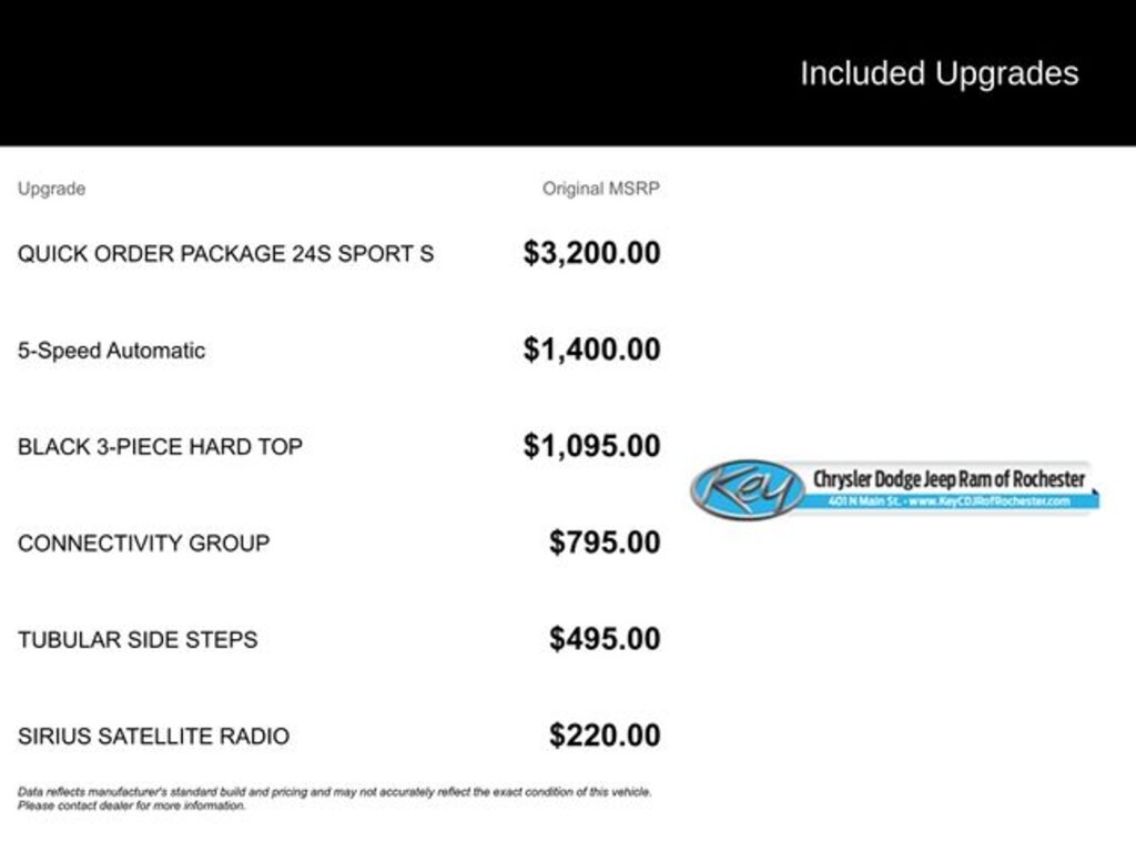 Key Chrysler Dodge Jeep Ram of Rochester is proud to present you with another True Market Priced Pre-Owned Vehicle. Transparent Pricing Of $ !! This 2018 Jeep Wrangler JK Unlimited Sport is loaded with the following Factory Options: Connectivity Group (Tire Pressure Monitoring Display, Uconnect Voice Command w/Bluetooth, and Vehicle Information Center), Power Convenience Group (Auto-Dimming Mirror w/Reading Lamp, Front 1-Touch Down Power Windows, Power Heated Mirrors, Power Locks, Remote Keyless Entry, and Security Alarm), Quick Order Package 24S Sport S (17" x 7.5" Aluminum Wheels, Chrome/Leather Wrapped Shift Knob, Deep Tint Sunscreen Windows, and Leather Wrapped Steering Wheel), 1-Yr SiriusXM Radio Service, 16" x 7.0" Luxury Styled Steel Wheels, 3.21 Rear Axle Ratio, 4-Wheel Disc Brakes, 8 Speakers, ABS brakes, Air Conditioning, AM/FM radio, Audio Jack Input for Mobile Devices, Black 3-Piece Hard Top, Brake assist, CD player, Cloth Seats w/Adjustable Head Restraints, Compass, Driver door bin, Driver Height Adjuster Seat, Driver vanity mirror, Dual front impact airbags, Electronic Stability Control, Freedom Panel Storage Bag, Front anti-roll bar, Front Bucket Seats, Front Center Armrest w/Storage, Front fog lights, Integrated roll-over protection, Low tire pressure warning, Normal Duty Suspension, Occupant sensing airbag, Outside temperature display, Passenger door bin, Passenger vanity mirror, Power steering, R1234YF A/C Refrigerant, Radio: 130, Rear anti-roll bar, Rear Window Defroster, Rear Window Wiper/Washer, Speed control, Split folding rear seat, Steering wheel mounted audio controls, Sunrider Soft Top, Tachometer, Tilt steering wheel, Traction control, Trip computer, Tubular Side Steps, and Variably intermittent wipers!!