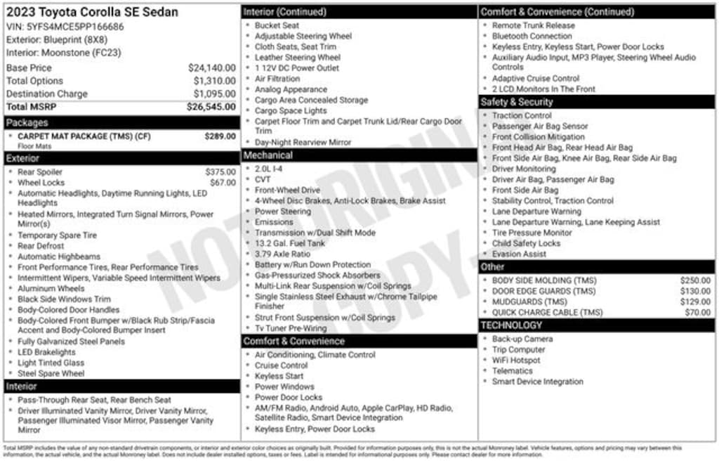 Key Chrysler Dodge Jeep Ram of Rochester is proud to present you with another True Market Priced Pre-Owned Vehicle. Transparent Pricing Of $ 20995 !! This 2023 Toyota Corolla SE is loaded with the following Factory Options: 4-Wheel Disc Brakes, 6 Speakers, ABS brakes, Air Conditioning, Alloy wheels, AM/FM radio: SiriusXM, Auto High-beam Headlights, Automatic temperature control, Brake assist, Bumpers: body-color, Delay-off headlights, Driver door bin, Driver vanity mirror, Dual front impact airbags, Dual front side impact airbags, Electronic Stability Control, Emergency communication system: Safety Connect (up to 10-year trial subscription), Exterior Parking Camera Rear, Four wheel independent suspension, Front anti-roll bar, Front Bucket Seats, Front Center Armrest, Front reading lights, Front Sport Seats, Fully automatic headlights, Heated door mirrors, Illuminated entry, Knee airbag, Leather steering wheel, Low tire pressure warning, Occupant sensing airbag, Outside temperature display, Overhead airbag, Panic alarm, Passenger door bin, Passenger vanity mirror, Power door mirrors, Power steering, Power windows, Premium Seat Trim, Radio data system, Radio: 8" Toyota Audio Multimedia, Rear anti-roll bar, Rear seat center armrest, Rear side impact airbag, Rear window defroster, Remote keyless entry, Speed control, Split folding rear seat, Spoiler, Steering wheel mounted audio controls, Tachometer, Telescoping steering wheel, Tilt steering wheel, Traction control, Trip computer, Turn signal indicator mirrors, Variably intermittent wipers, and Wheels: 18" Alloy w/Graphite Finish!!
